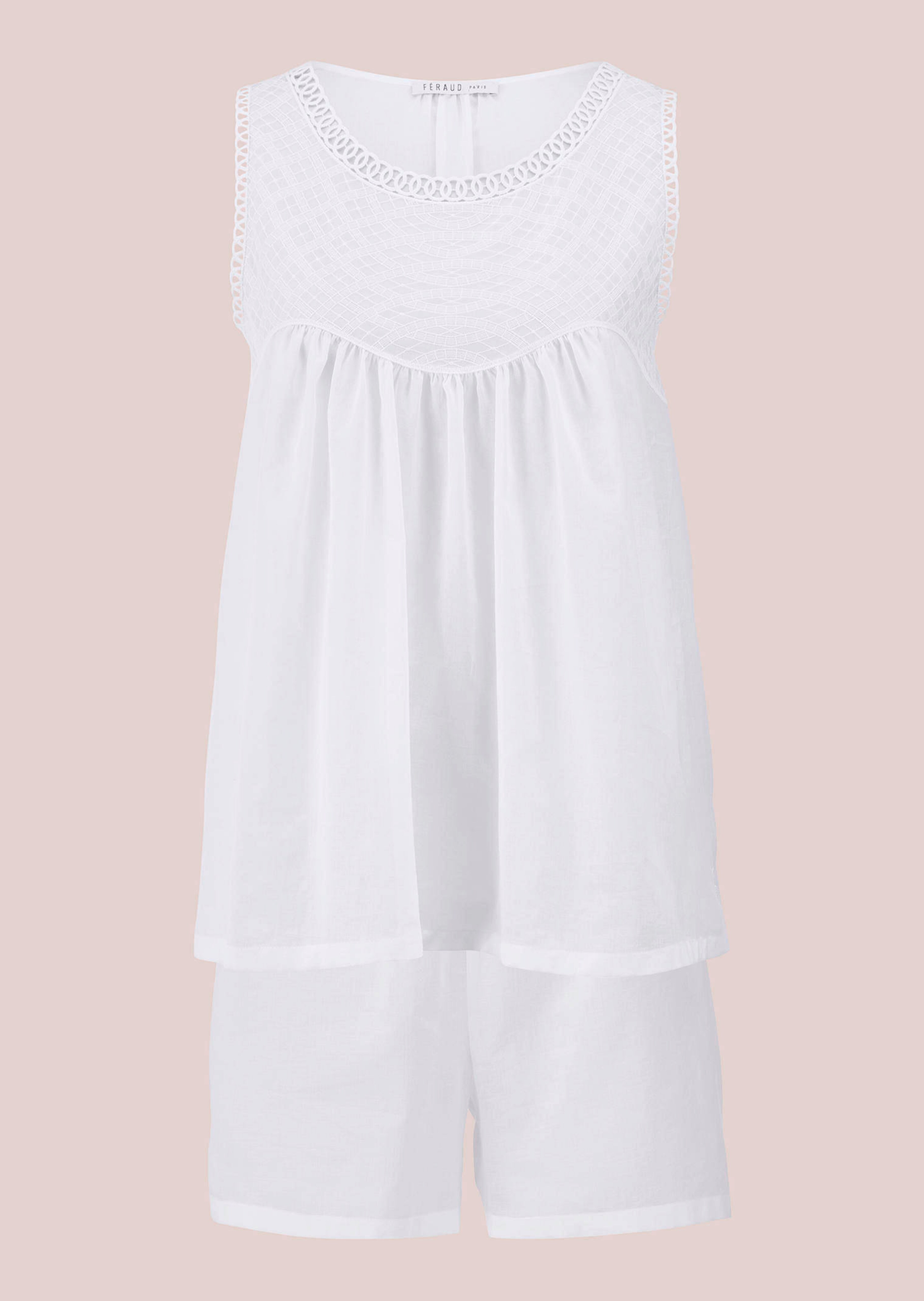 Modèle léger et confortable, avec détails raffinés. Pyjashort FERAUD en pur coton, avec empiècement fantaisie en dentelle. Haut sans manches à la coupe décontractée style babydoll et short confortable avec taille entièrement élastiquée. Fentes latérales pour plus d'aisance et un look féminin. Un indispensable pour toutes celles qui aiment le linge de nuit raffiné.