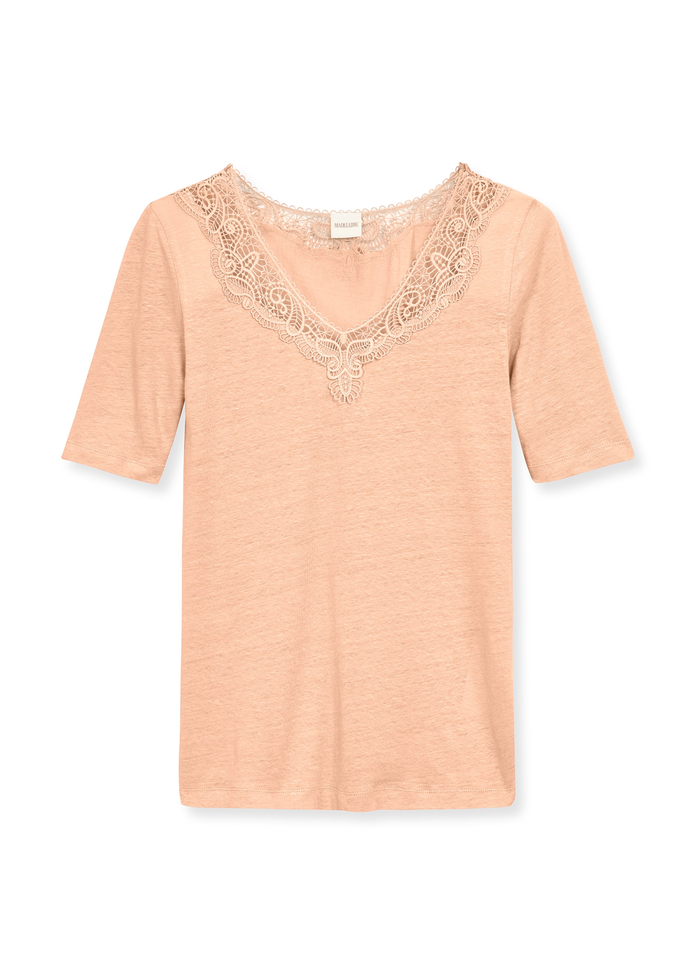 Jersey légèrement transparent avec empiècements en dentelle devant et au dos. Petites fentes latérales.