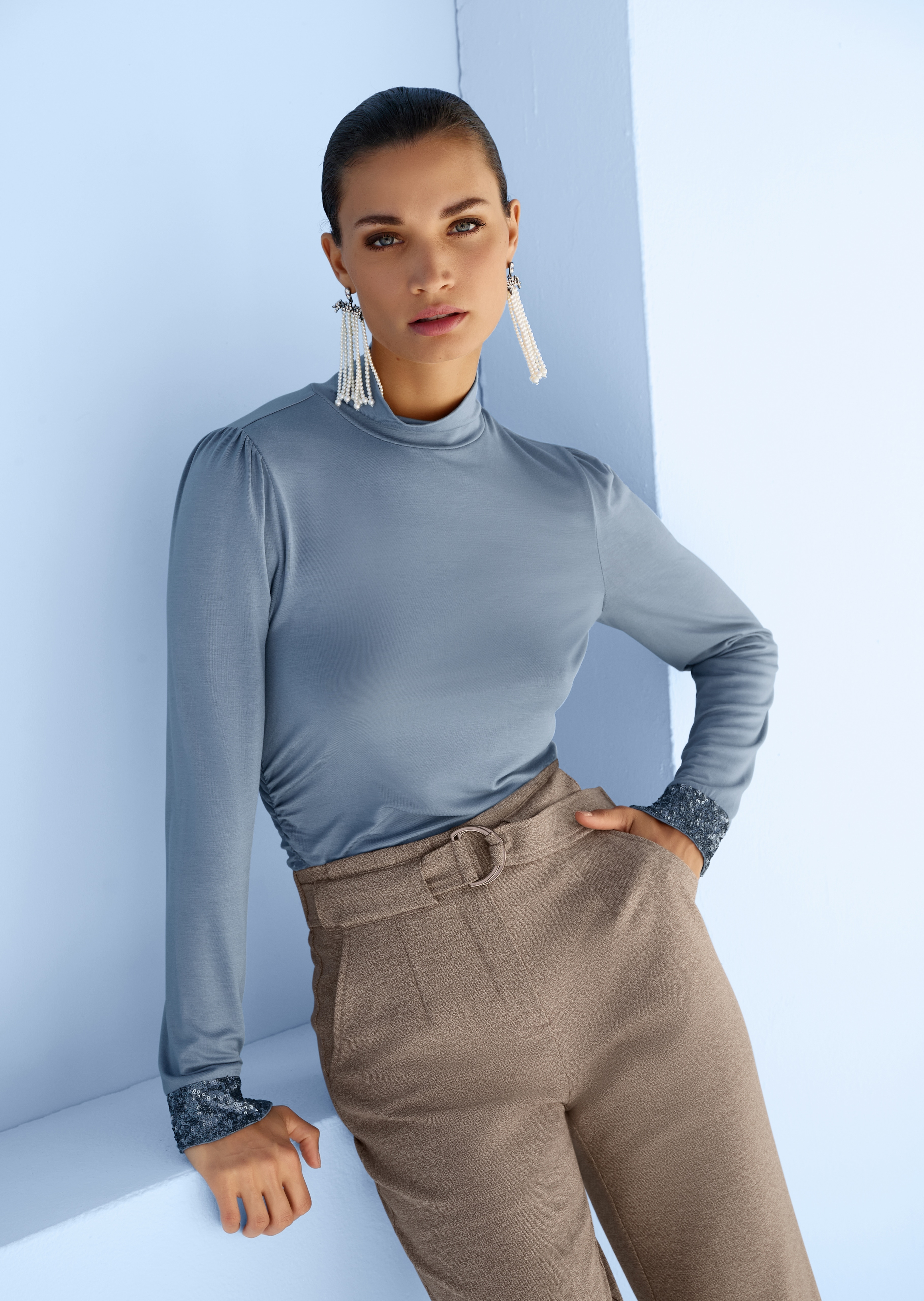 Coupe féminine décontractée et cintrée. Col montant, manches longues et fronces sur les épaules et sur les coutures des côtés. Poignets fendus et ornés de paillettes.