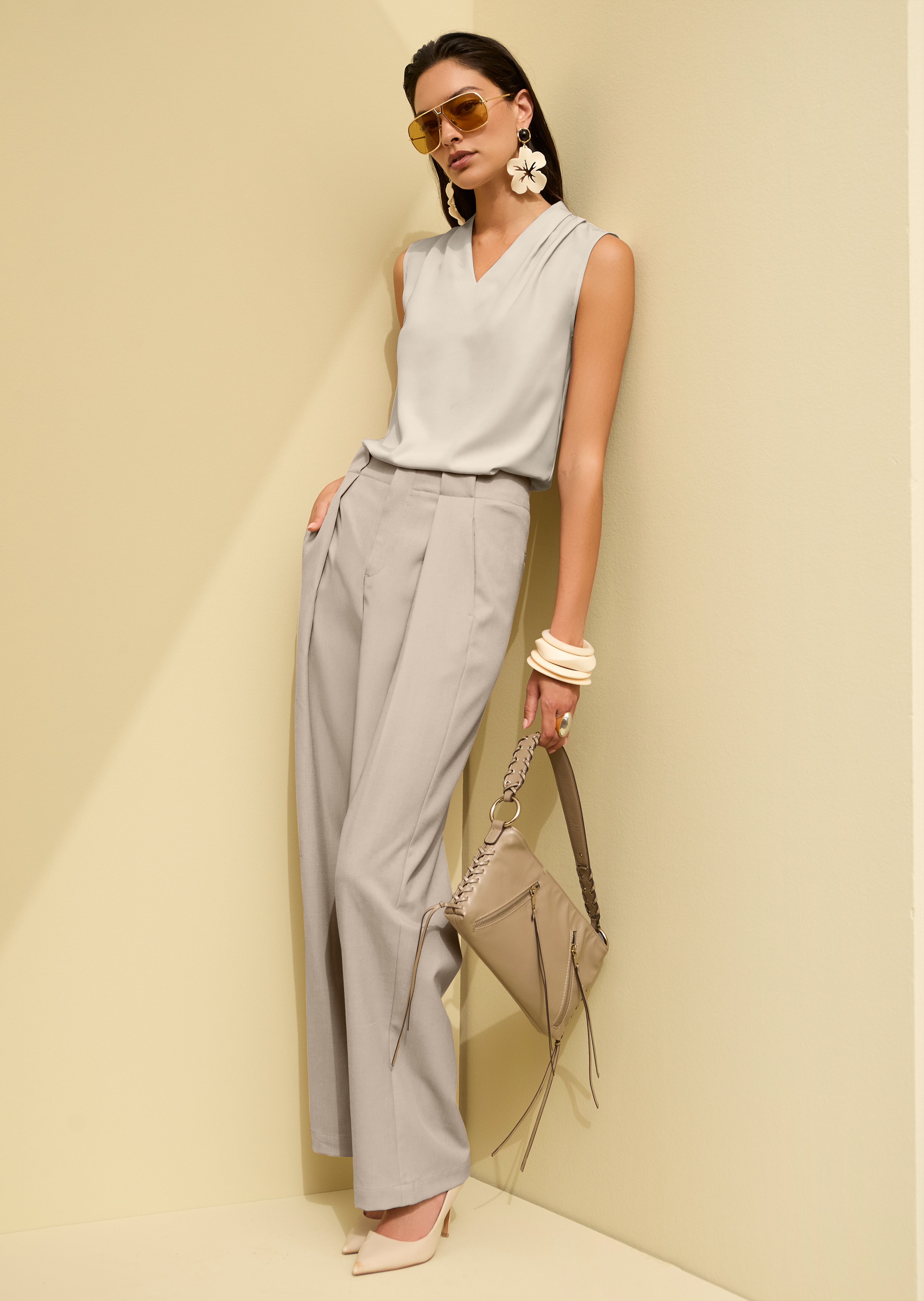 Coupe féminine et décontractée. Sans manches. Plis sur les épaules et encolure en V avec large empiècement. Base droite. Fente boutonnée sur la nuque.
