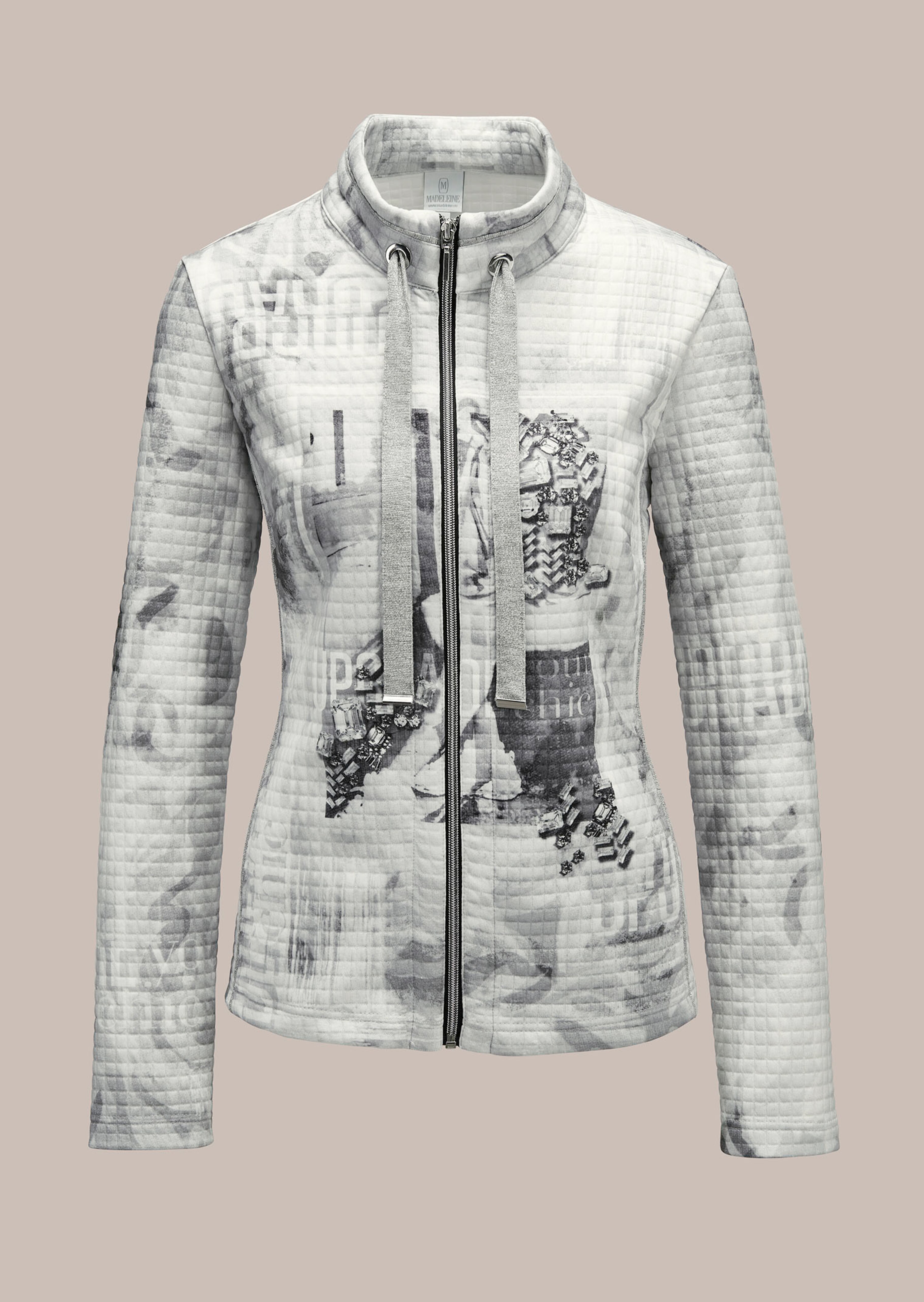 Aspect gaufré tendance, avec imprimé. Confortable matière stretch. Coupe courte légèrement cintrée. Manches longues, zip et col montant avec rubans de serrage fantaisie.