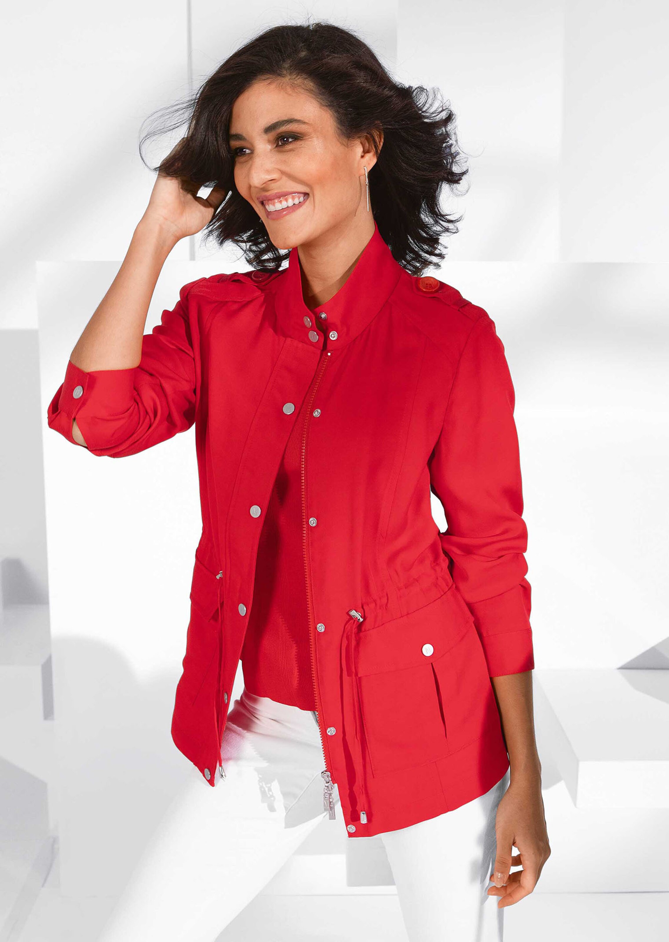 Un modèle tendance ultraléger à la coupe décontractée. Zip double curseur sous patte pressionnée, col montant à fermer haut et poches plaquées à rabat pressionné. Manches longues avec poignets pressionnés. Passant tunnel à la taille.