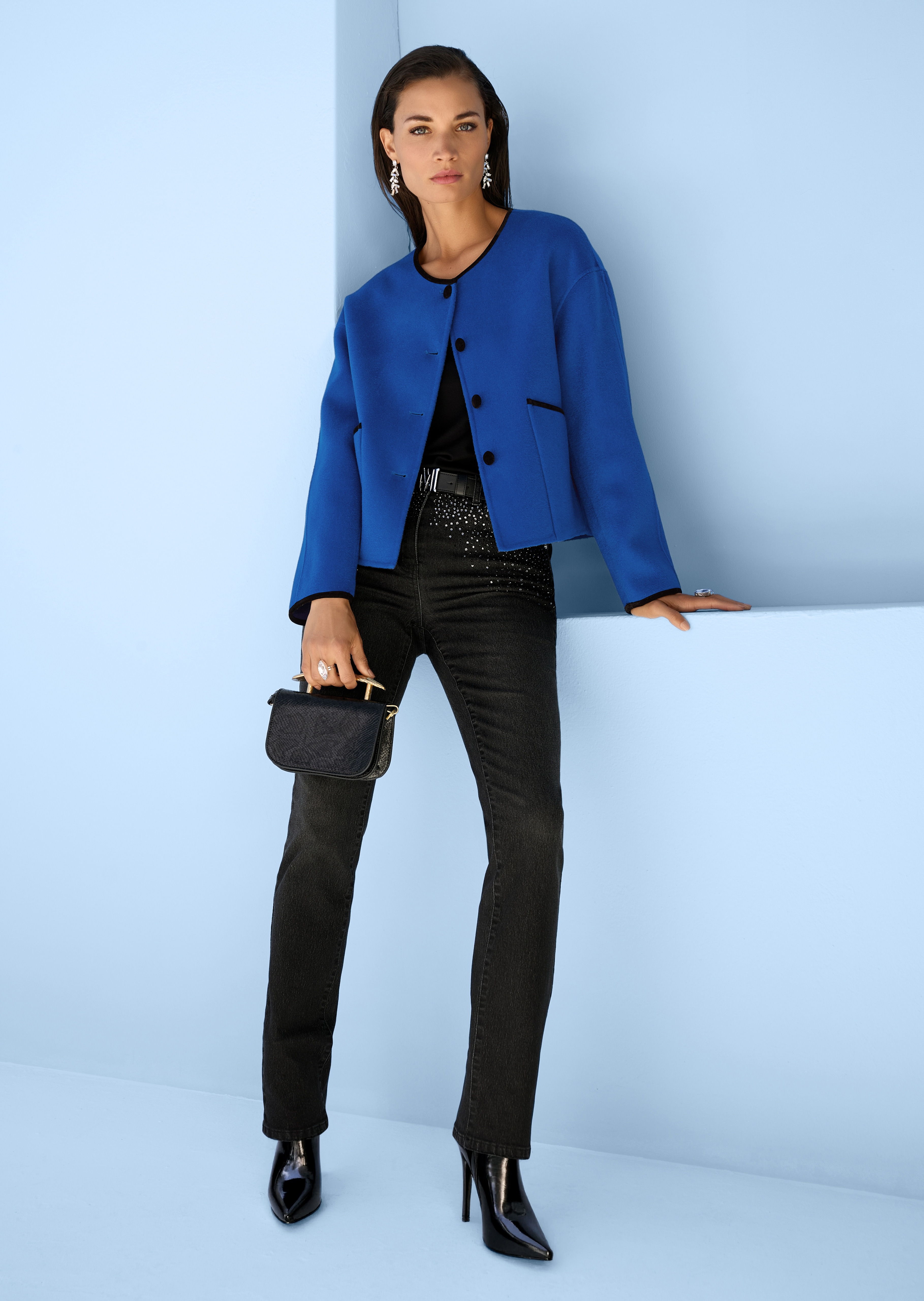 Coupe courte tendance, sans col. Style contrastant, avec encolure arrondie, épaules descendues, manches longues et boutonnage simple. Poches plaquées à rabat.