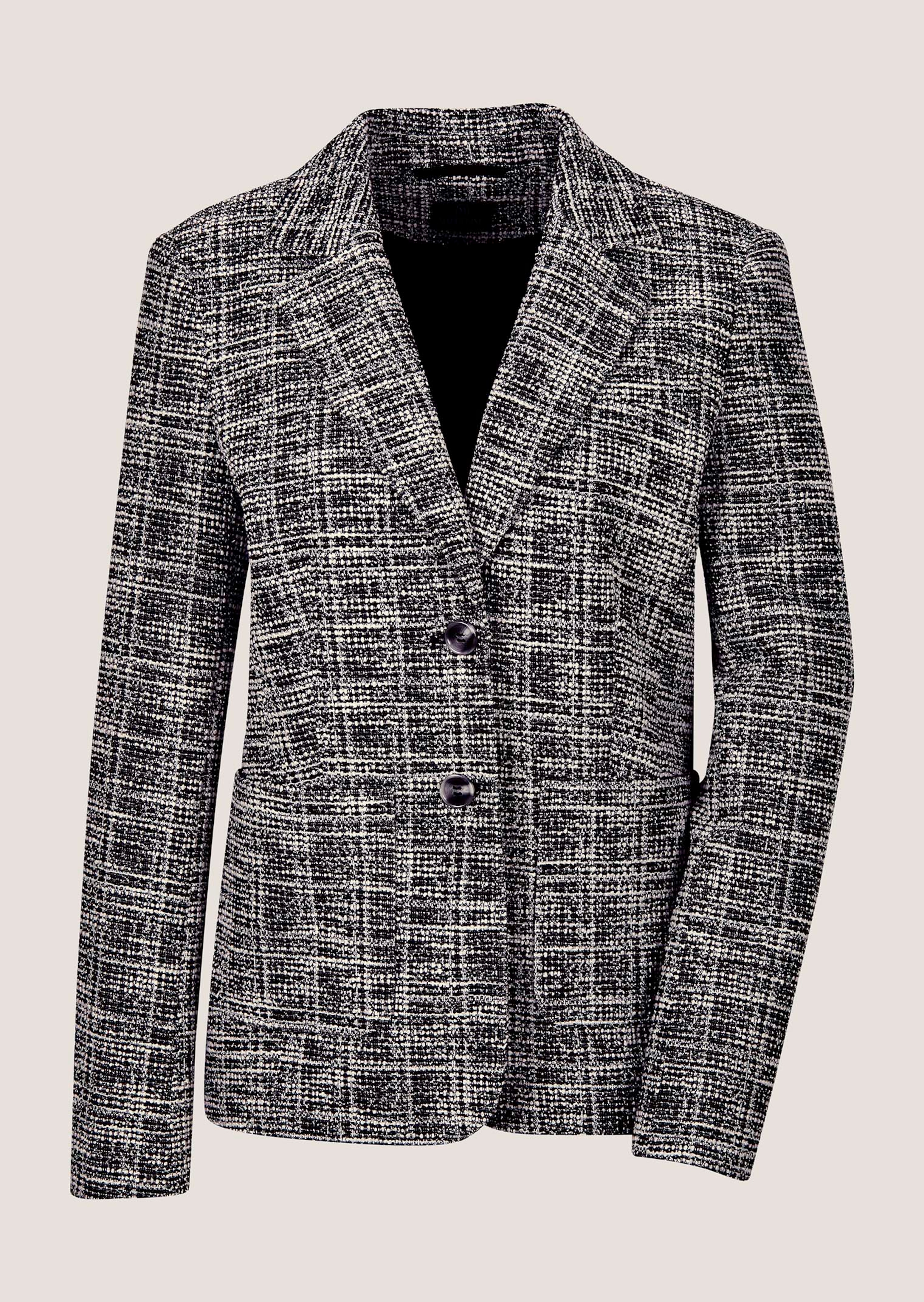 Jersey souple, aspect tweed structuré. Col à revers, poches plaquées et manches longues avec bord boutonné. La matière est ennoblie par un fil fantaisie légèrement brillant. Fermé par deux boutons. Intérieur passepoilé.
