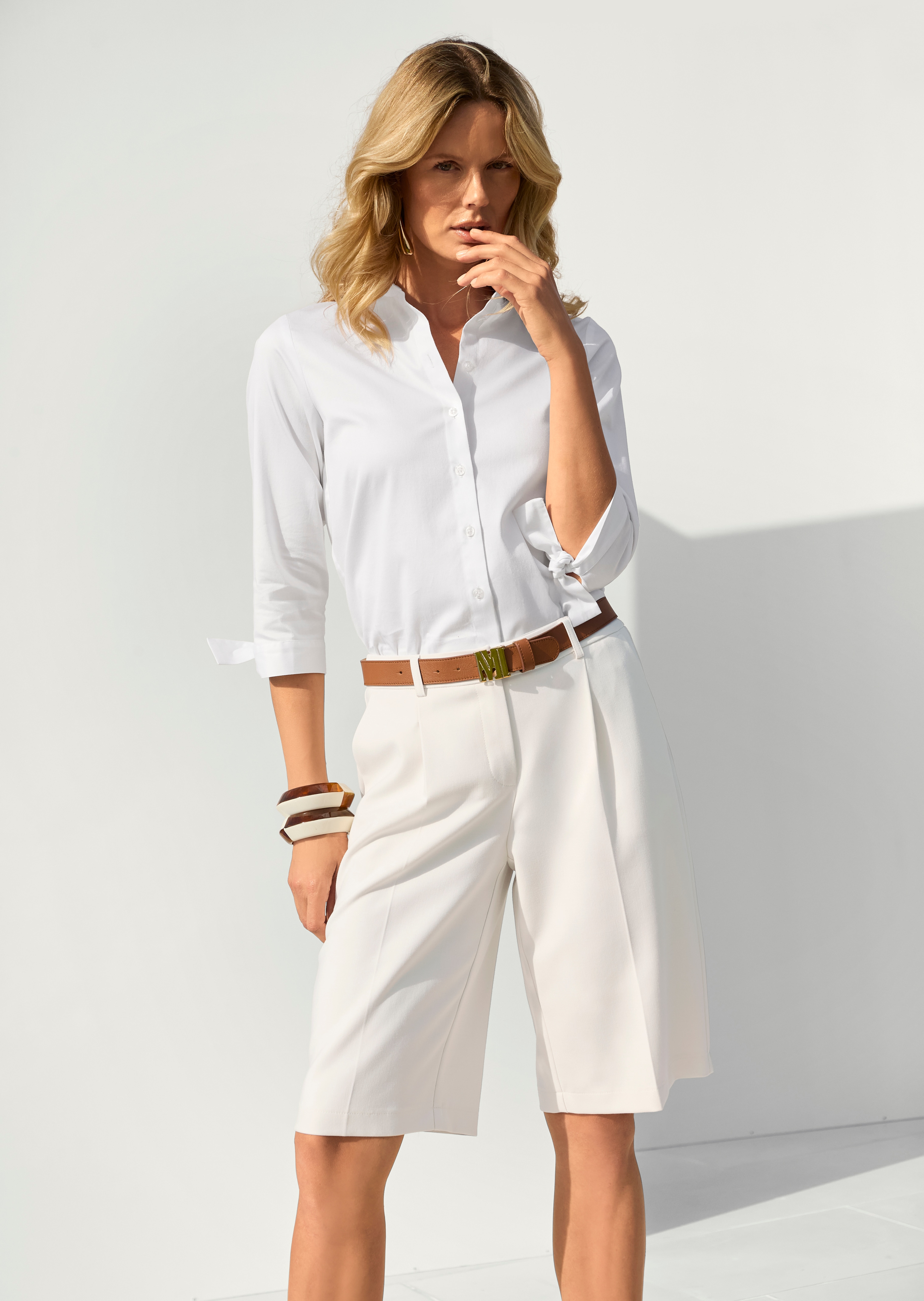 Confortable satin de coton stretch légèrement brillant. Manches 3/4 avec nœuds. Matière fraîche et agréable sur la peau. Col chemisier et base arrondie. Bande de boutonnage avec boutons logo au style authentique.