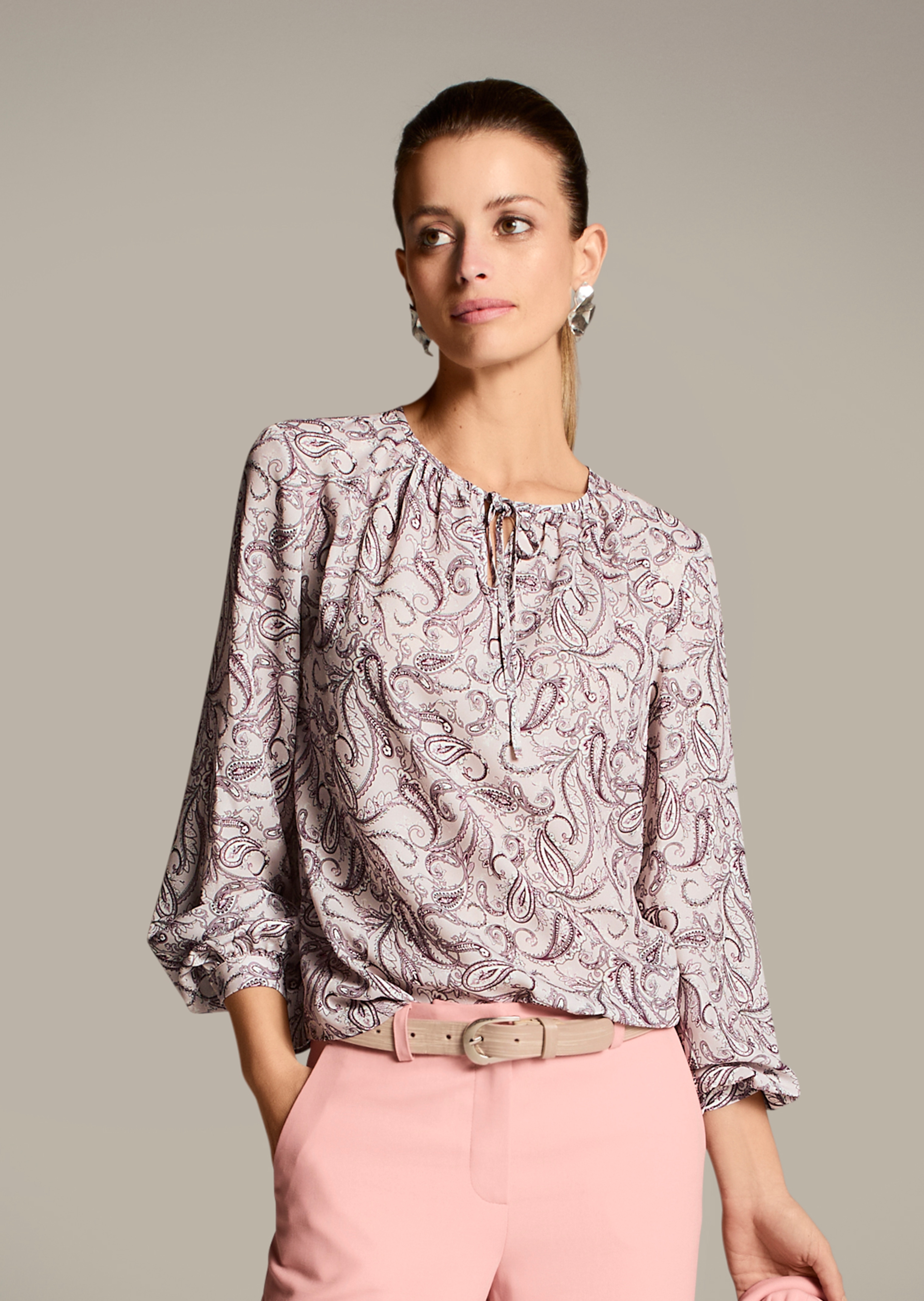 Georgette finement structurée. Imprimé cachemire romantique: chaque modèle est unique. Style fantaisie tendance. Encolure arrondie avec petits plis et fins rubans à nouer et manches longues.