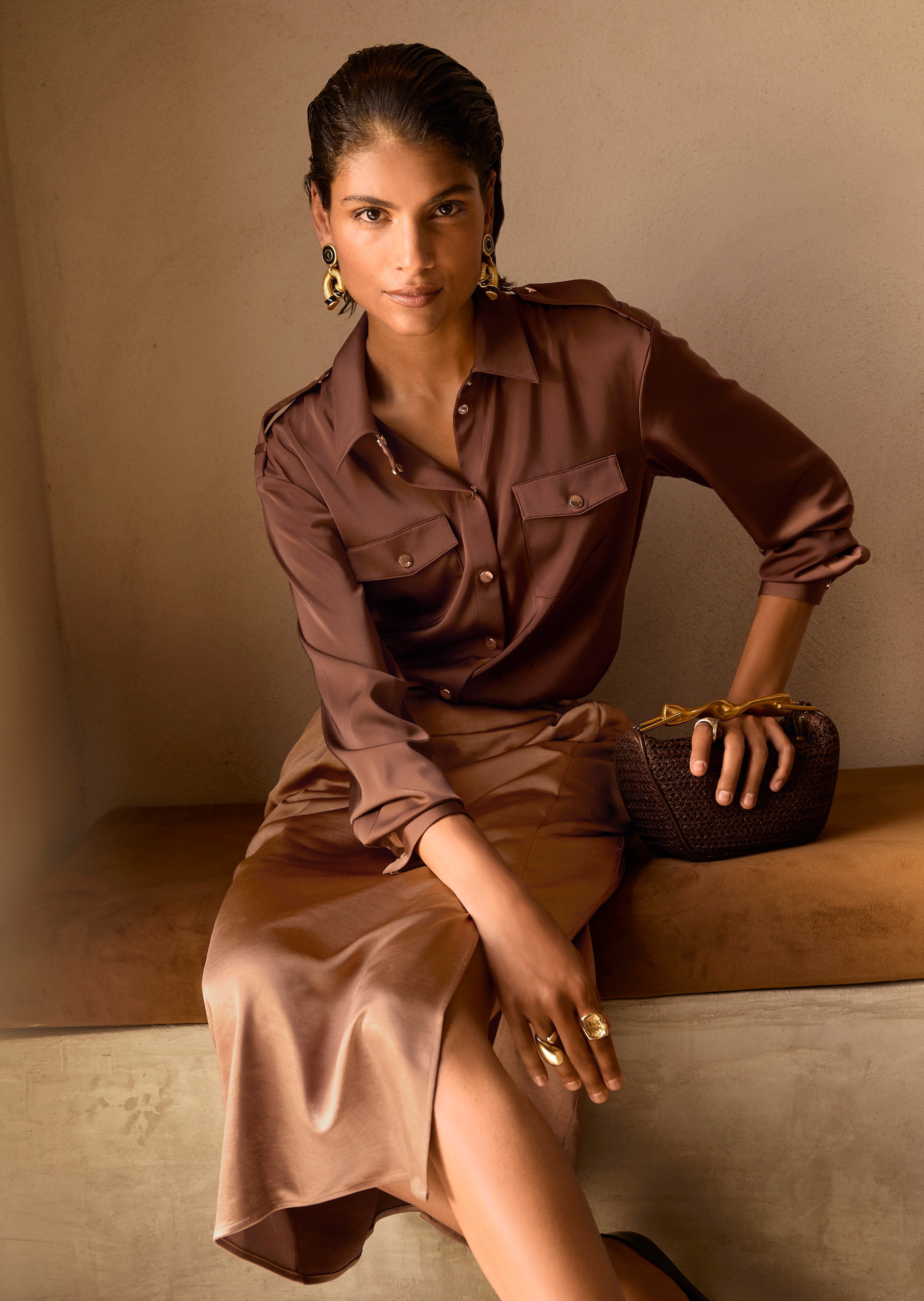 Chemisier tendance au style utilitaire, à la coupe décontractée. Poches poitrine plaquées à rabat, pattes d'épaules et boutons-pression coloris doré. Coupe droite et manches longues avec poignets.