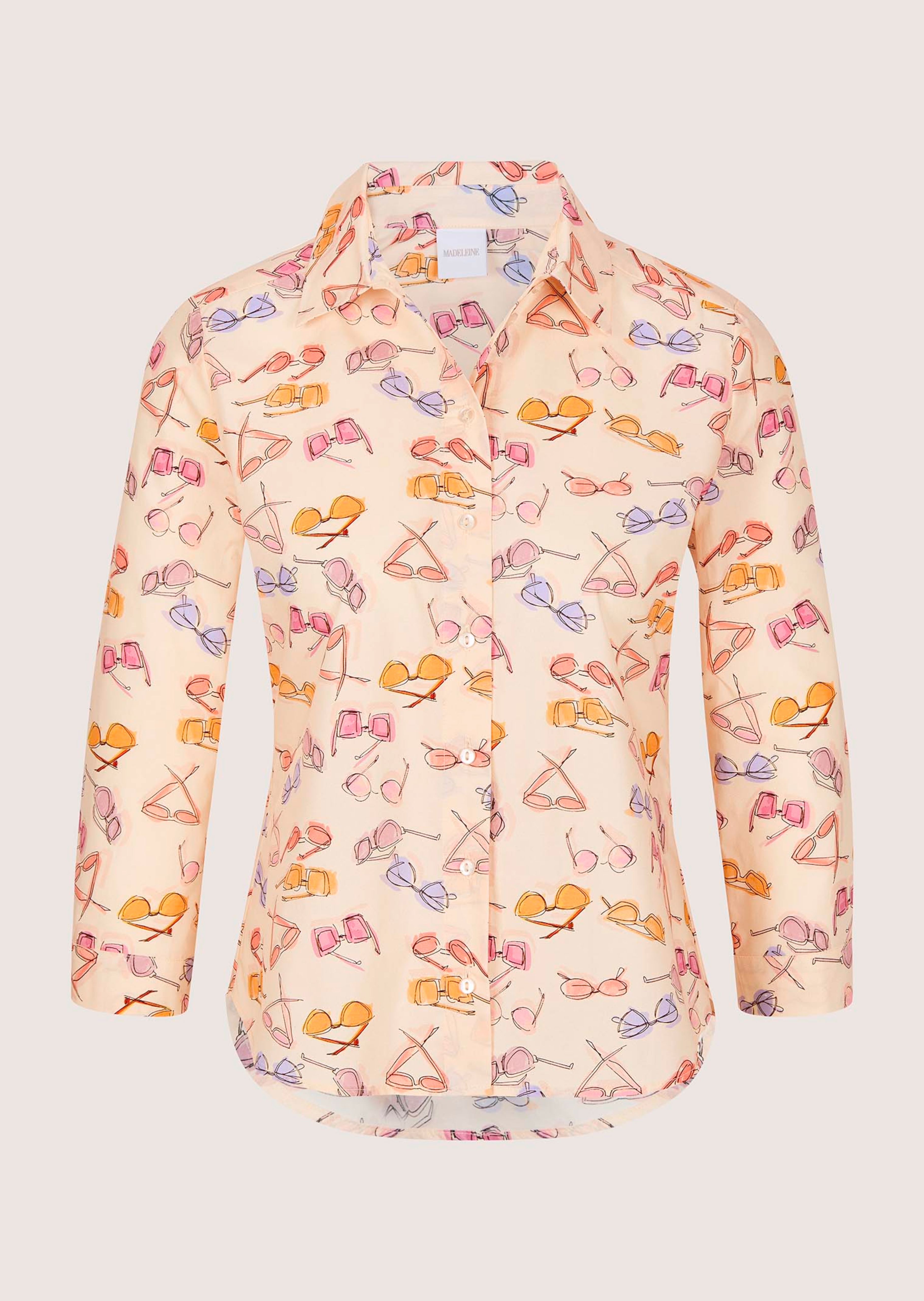 Un modèle au magnifique motif estival. L'imprimé multicolore unique attire tous les regards. Coupe cintrée, bande de boutonnage, empiècement sur les épaules, base arrondie et manches 3/4 avec poignets.