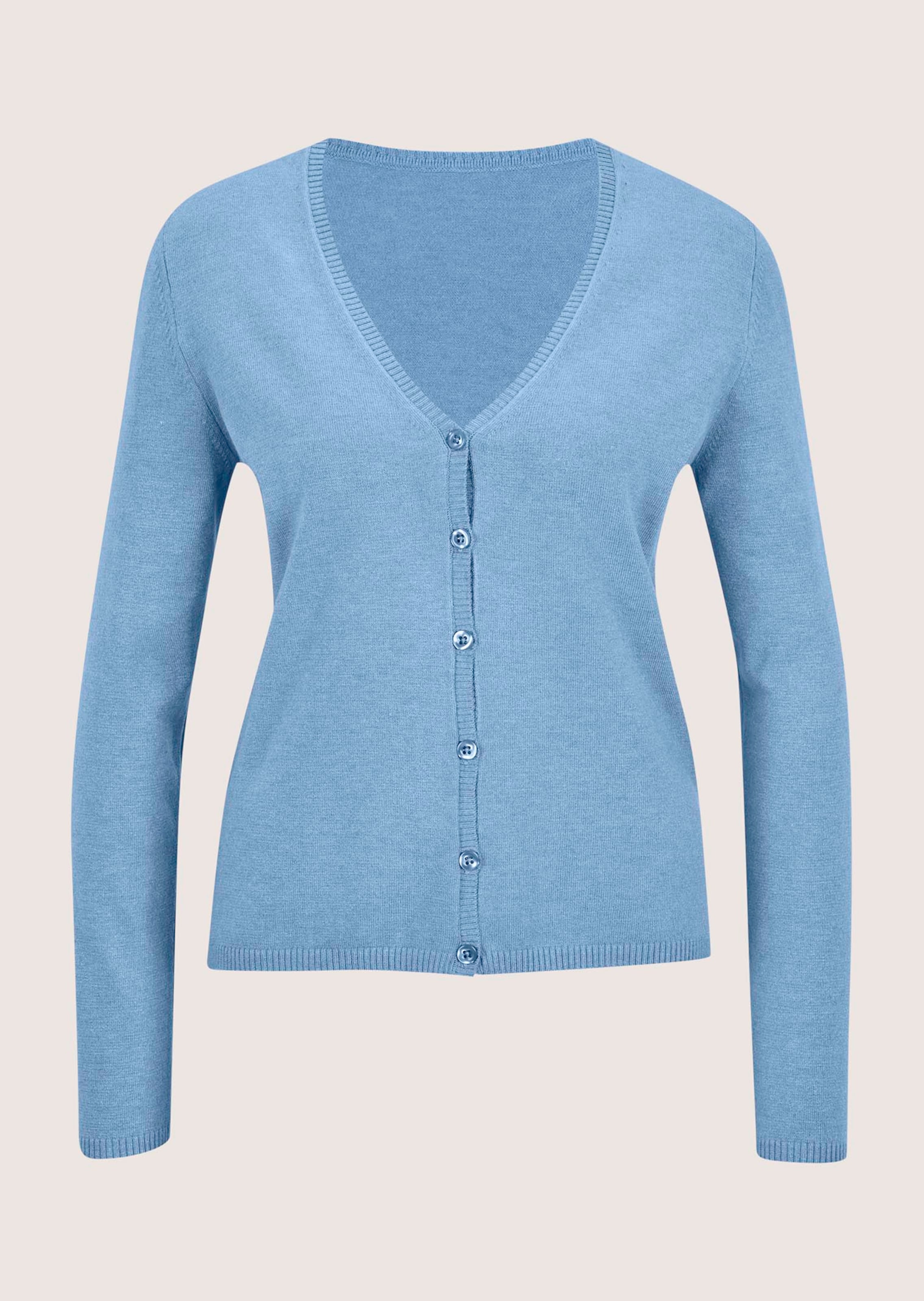 Fine maille haut de gamme. Coupe courte tendance. Profonde encolure en V, manches longues et bande de boutonnage avec boutons ton sur ton. Fins bords-côtes au bas des manches, sur l'encolure et à la base.