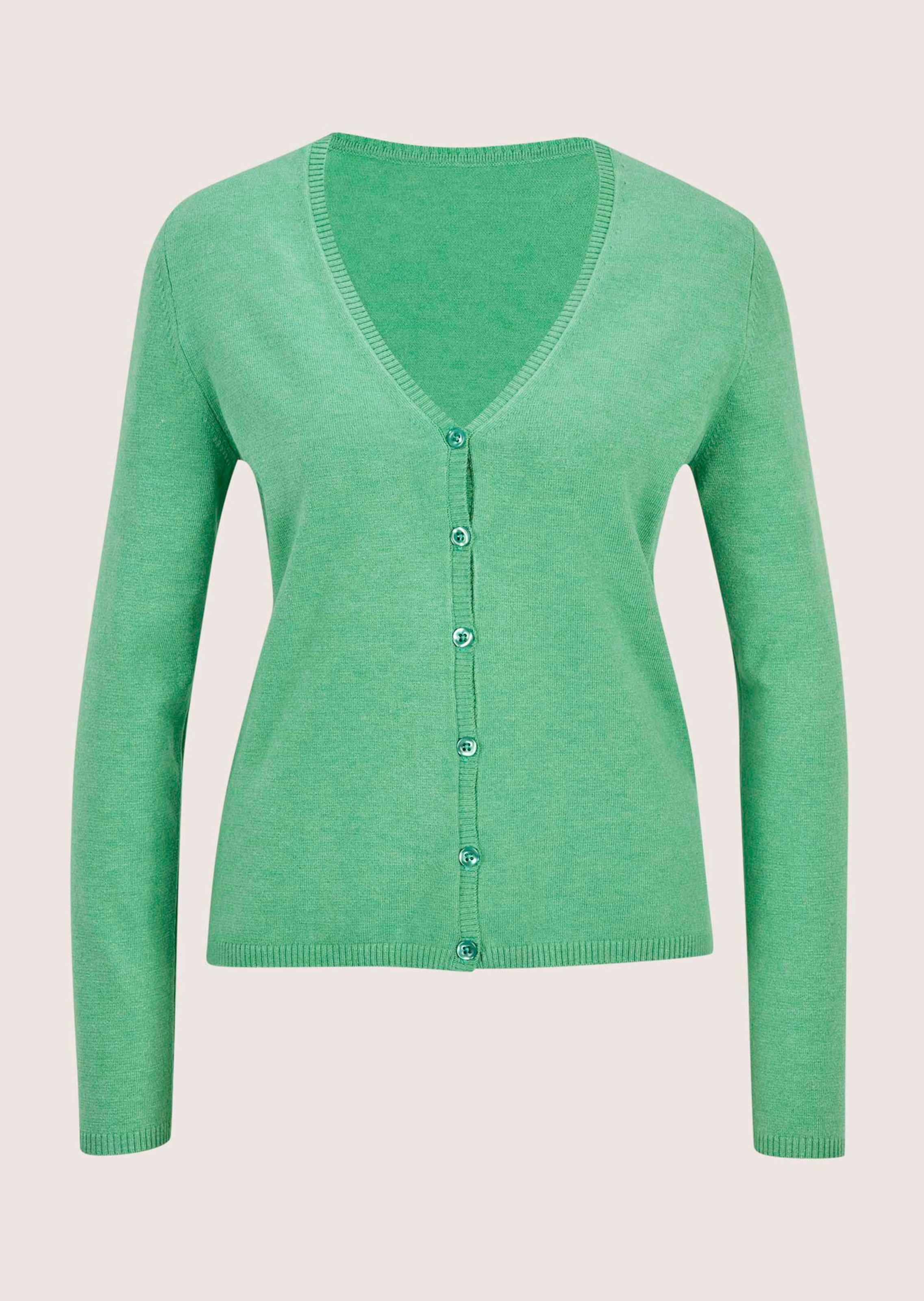 Fine maille haut de gamme. Coupe courte tendance. Profonde encolure en V, manches longues et bande de boutonnage avec boutons ton sur ton. Fins bords-côtes au bas des manches, sur l'encolure et à la base.