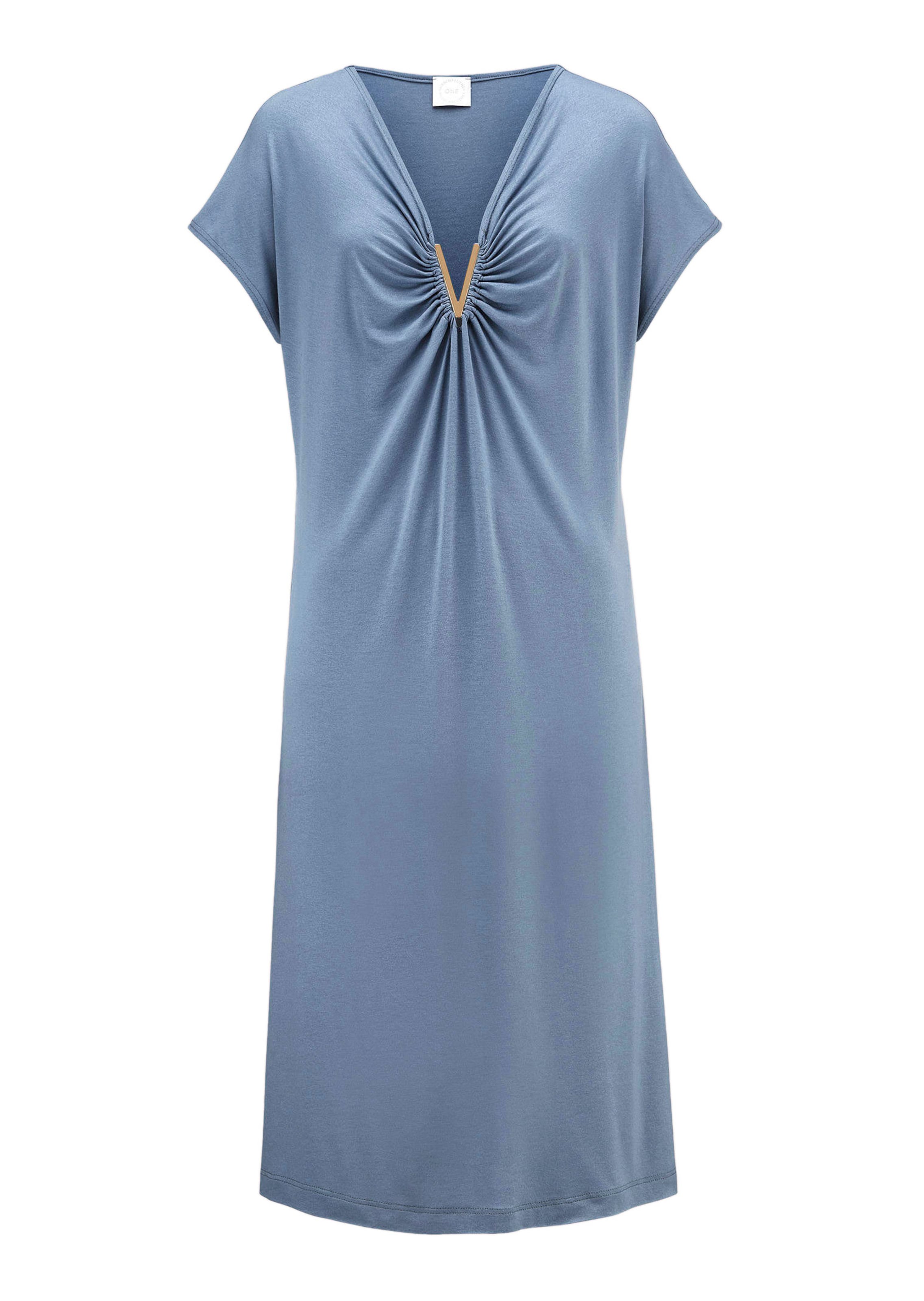 Chemise de nuit HUTSCHREUTHER. Modèle raffiné en viscose fluide. Encolure en V ornée d'un élément en métal brillant et légèrement froncée, pour une note féminine. Coupe tendance avec épaules descendues et longues fentes latérales, pour une ligne élégante et harmonieuse.