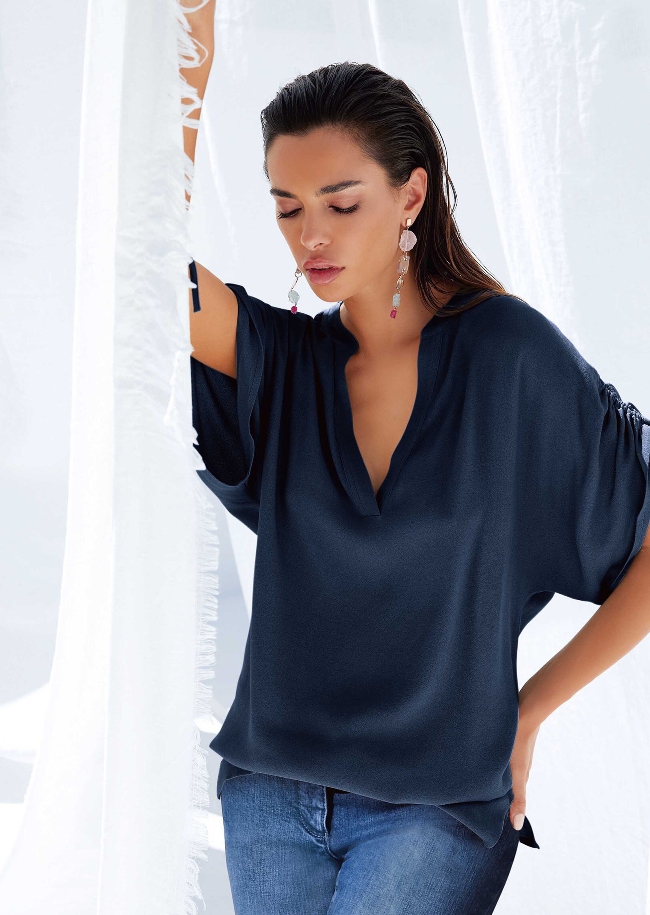 Coupe maxi tendance. Encolure en V et base fendue sur les côtés. Épaules descendues et manches coude à varier avec lien et passant tunnel.