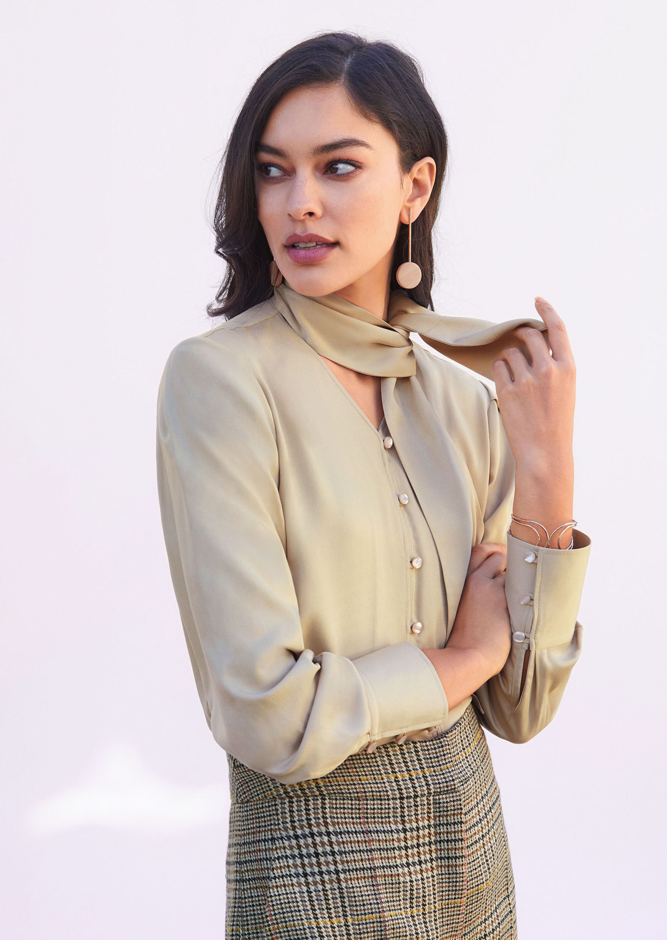 Encolure en V avec lavallière, manches longues à poignets et plis sur les épaules. Base arrondie et fermeture par boutons et brides.