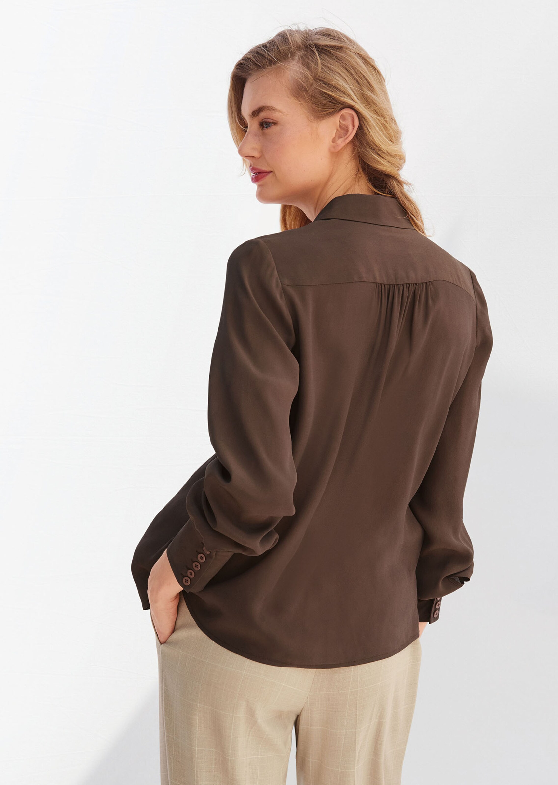 Légèrement brillant avec plis nervures et larges poignets boutonnés. Base arrondie. Fronces sous le double empiècement dos.
