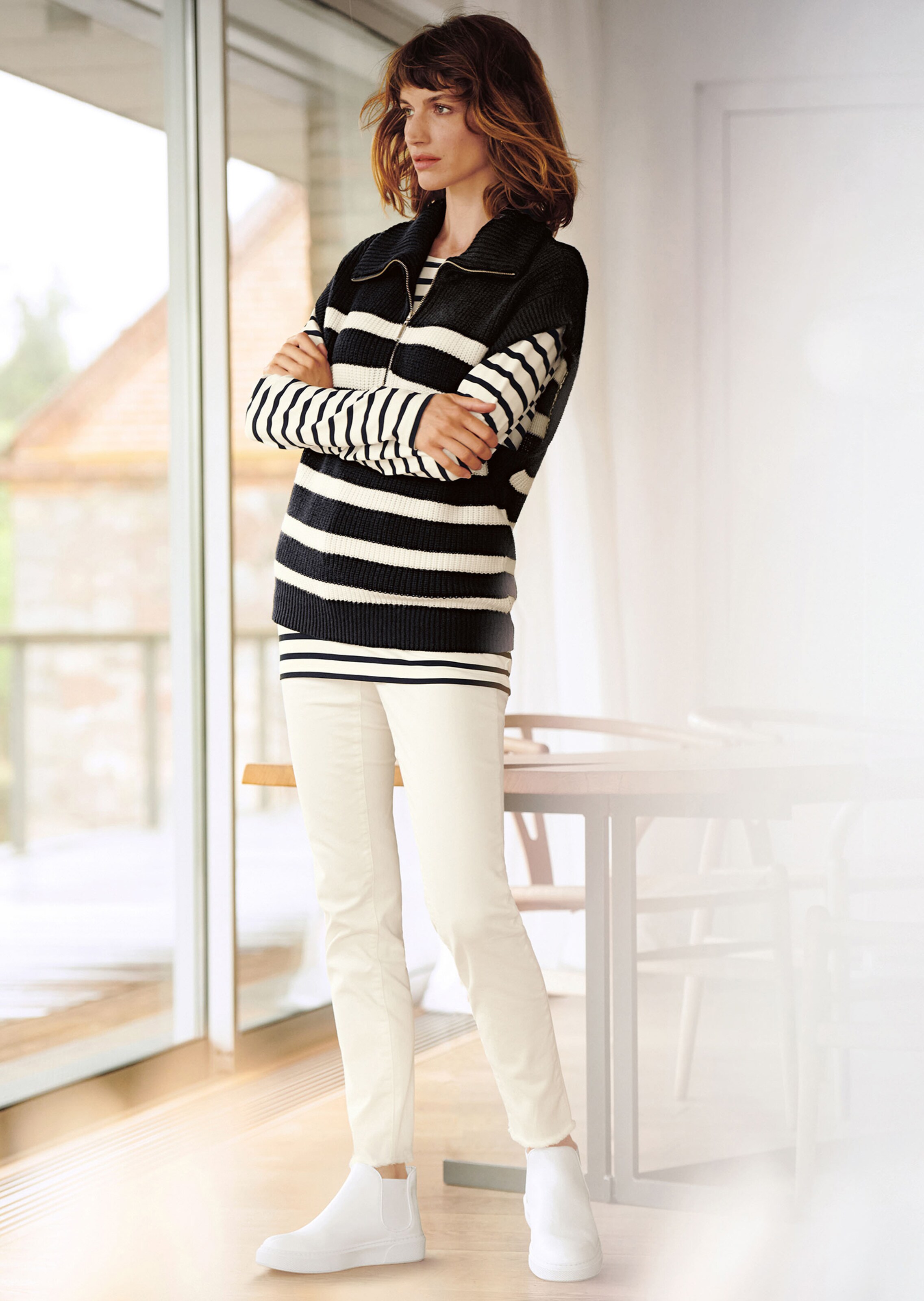 Style camionneur avec rayures style marin. Ligne maxi décontractée. Douce maille en côtes perlées. Col camionneur, zip, épaules descendues et bords-côtes d'une tenue irréprochable.