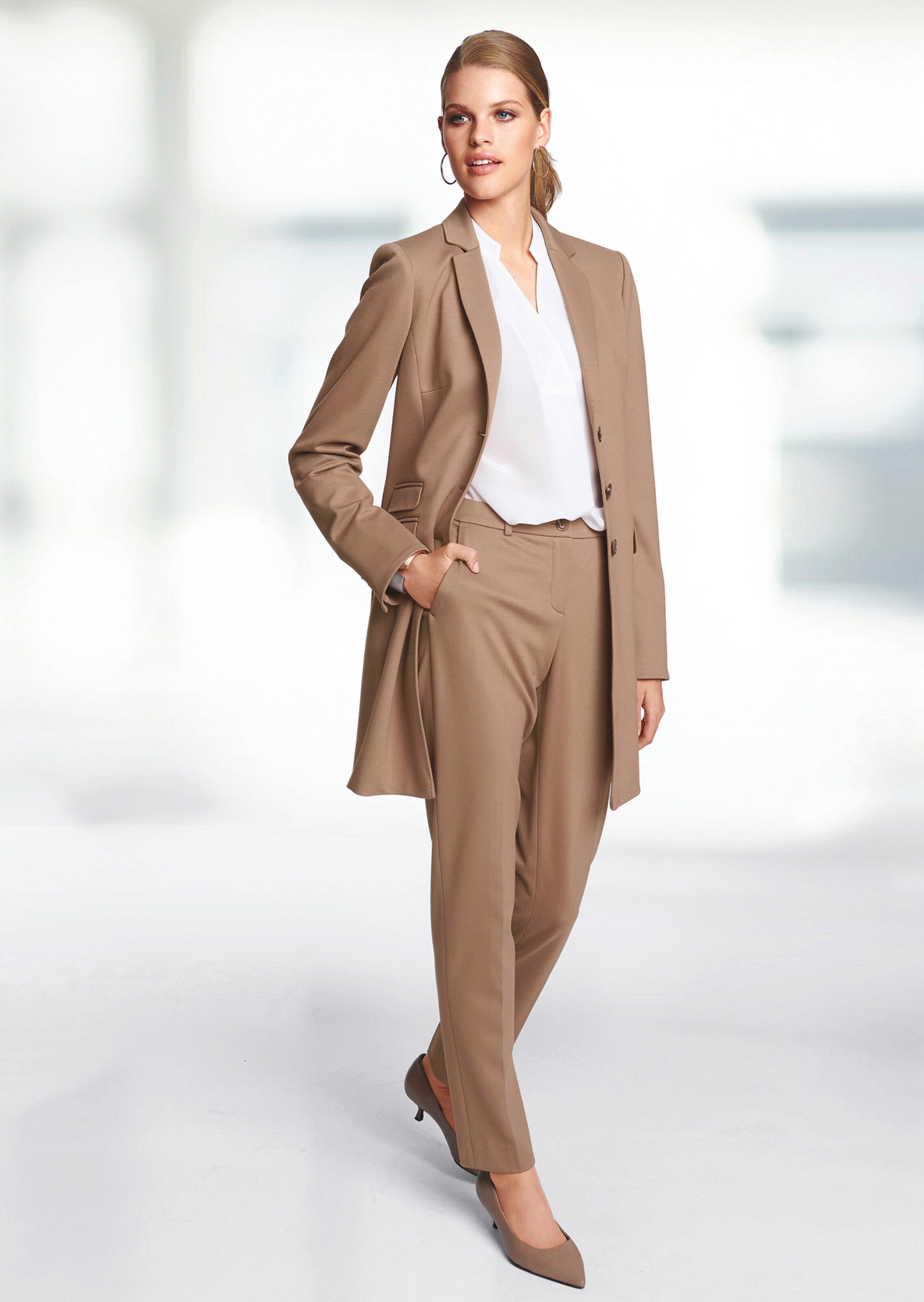 Jersey agréable à porter. Ligne conique. Poches côtés en biais et passepoils fantaisie au dos. Plis marqués devant et au dos.