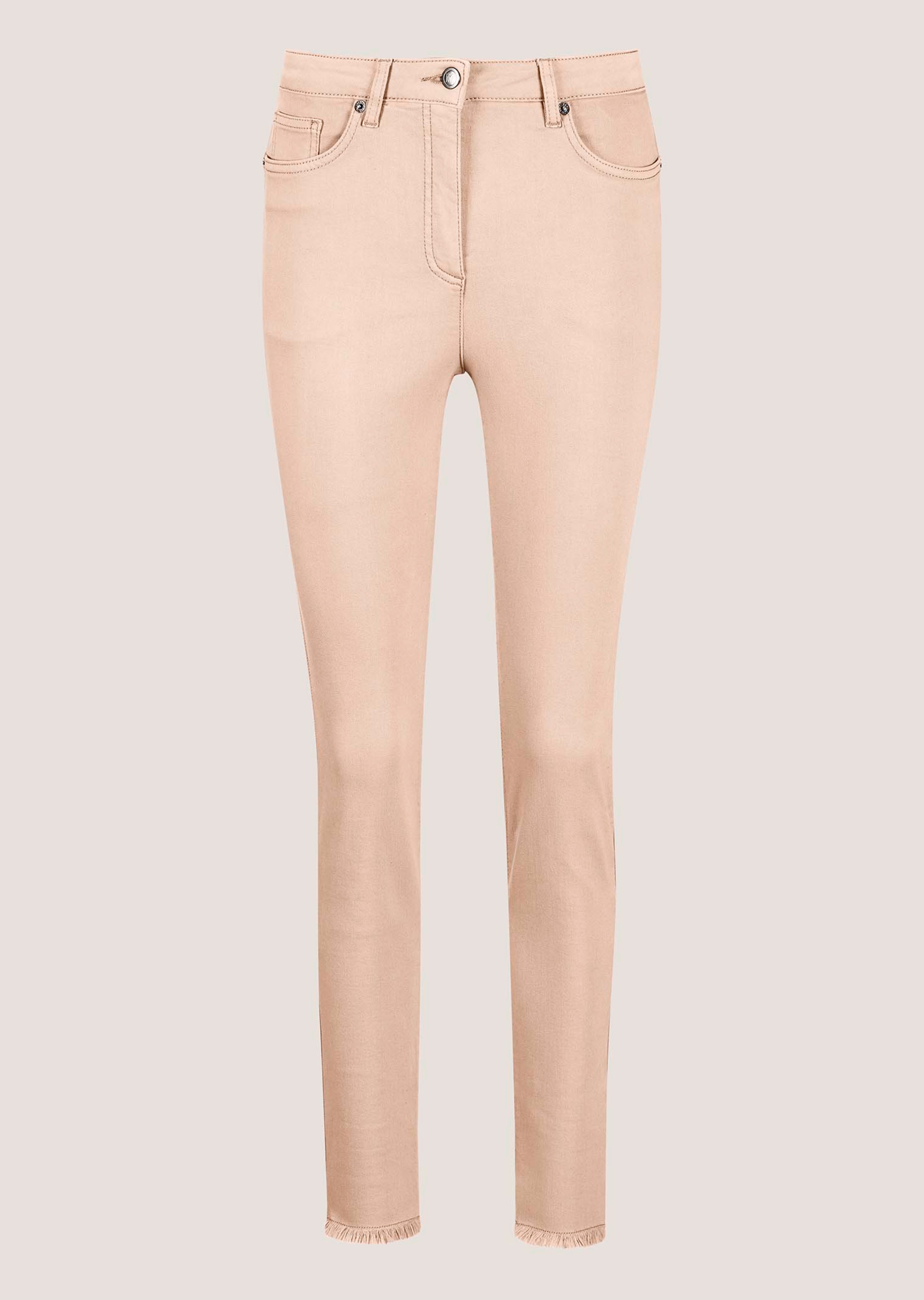 Coupe Skinny Fit. 5 poches, logo, passants de ceinture et franges au bas des jambes.