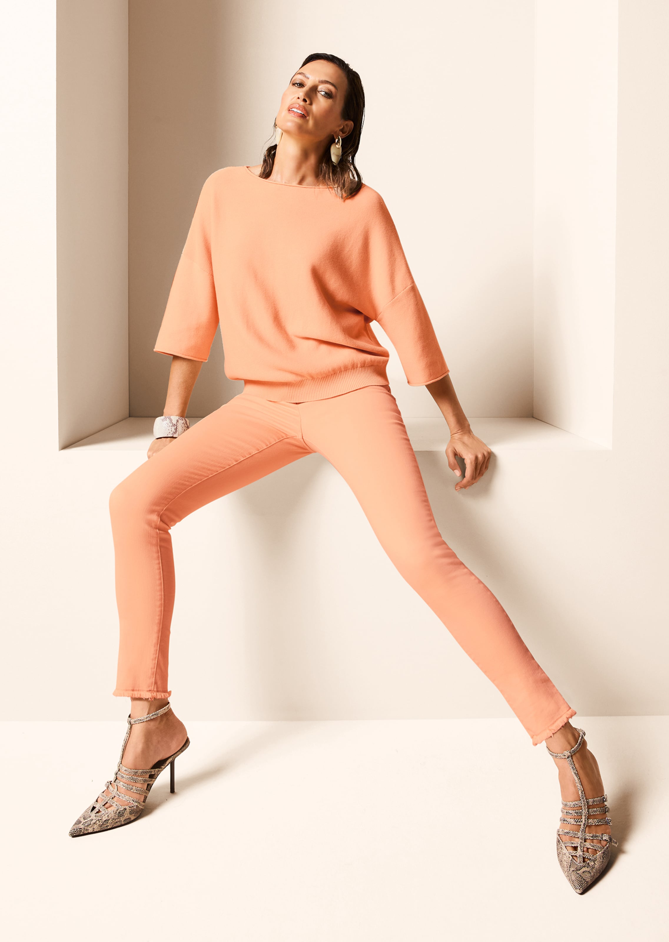 Coupe Skinny Fit. 5 poches, logo, passants de ceinture et franges au bas des jambes.