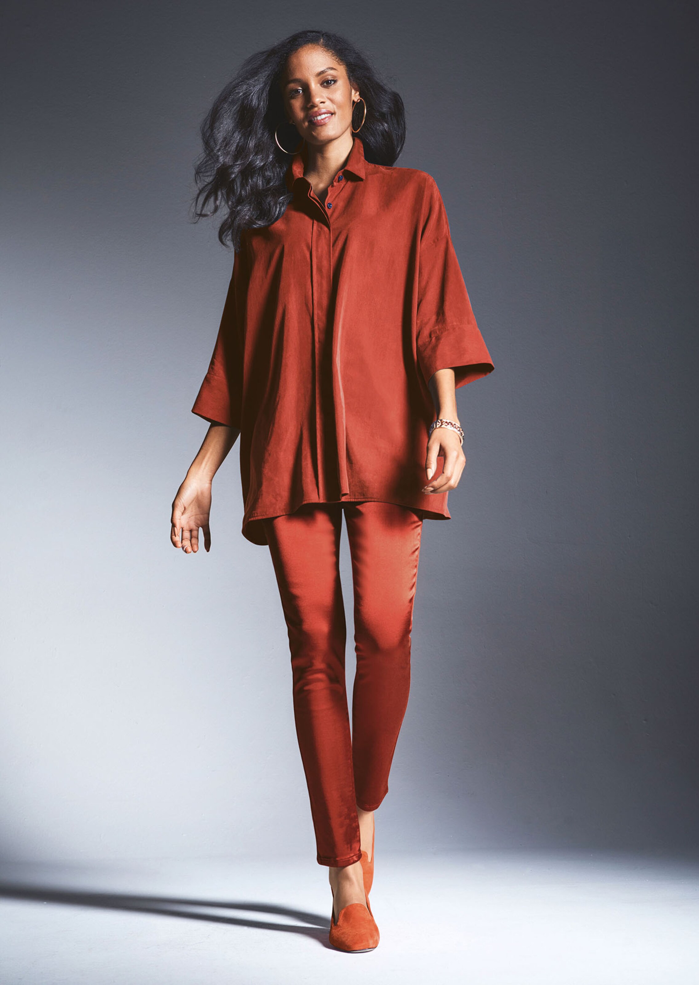 Ligne impeccable et satin brillant. Coupe près du corps, longueur cheville. 5 poches. Bouton «M», passants, poches arrondies et rivets MADELEINE. Empiècement en V et poches plaquées au dos.