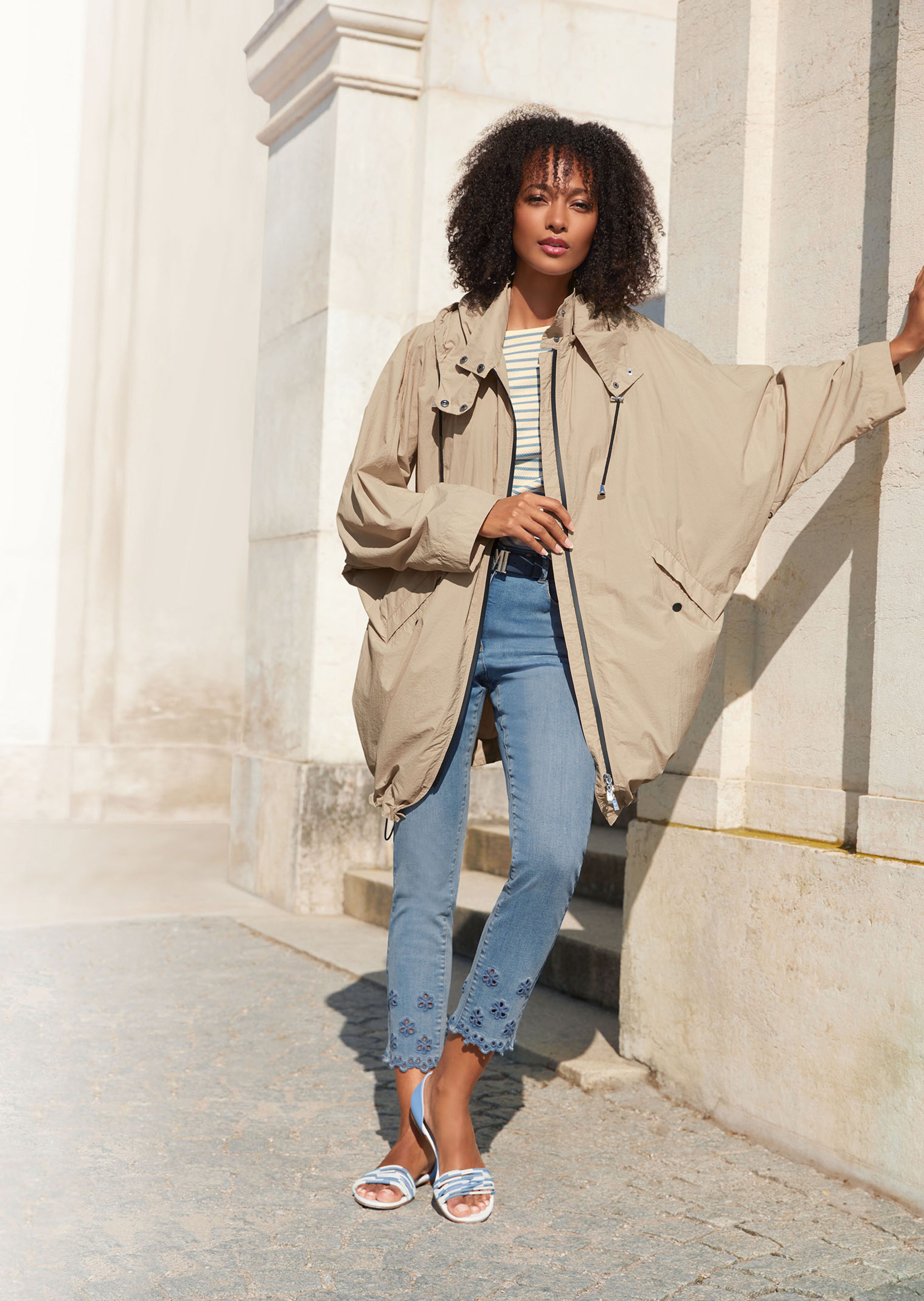 5 poches. Effet push-up. Bord fantaisie avec broderie ajourée au bas des jambes. Poches plaquées et empiècement arrondi au dos. Longueur 7/8.