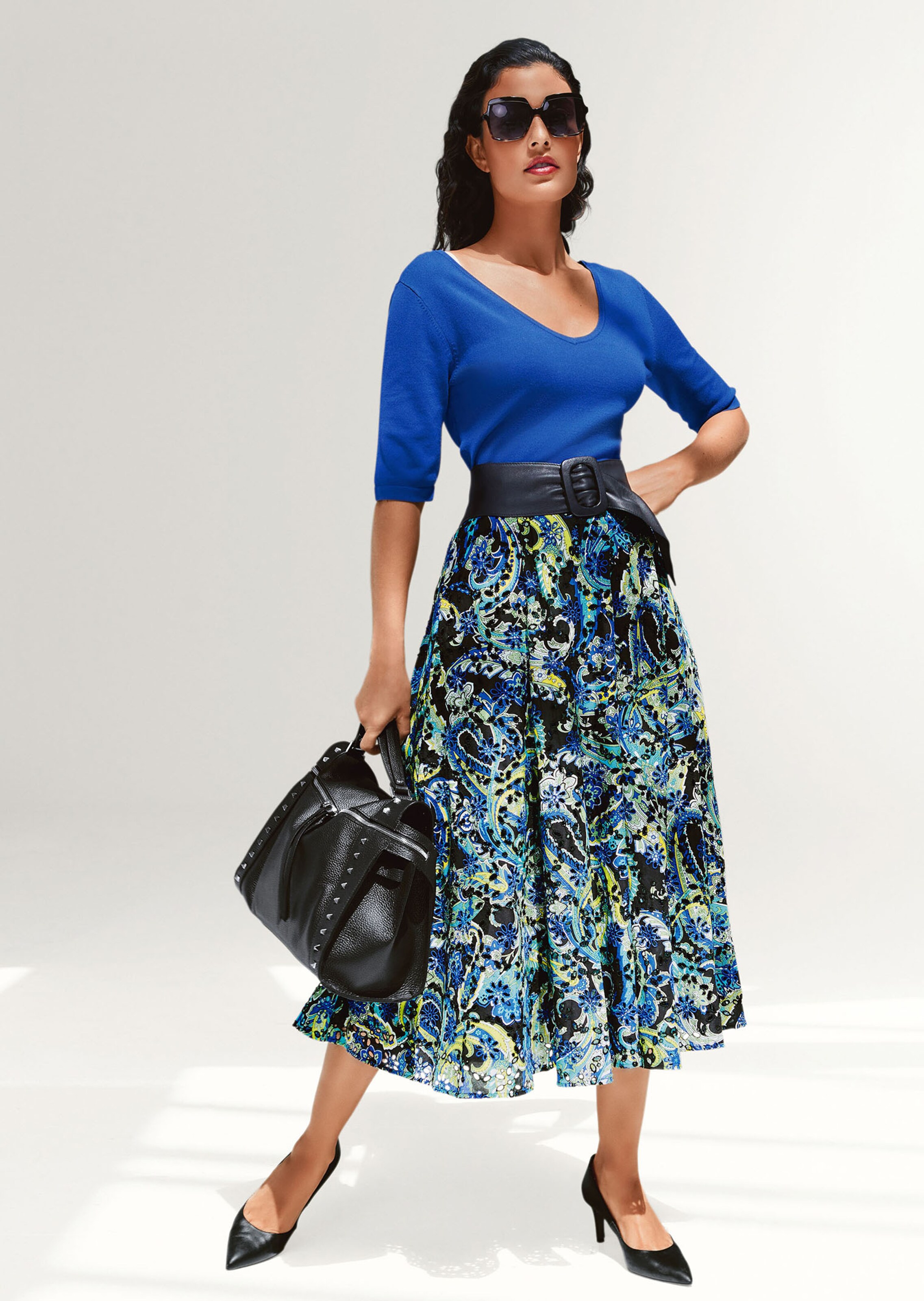 Broderie de Madère et imprimé cachemire. Chaque jupe est unique. Poches dans les coutures et zip au dos. Empiècement extensible à la taille au dos.