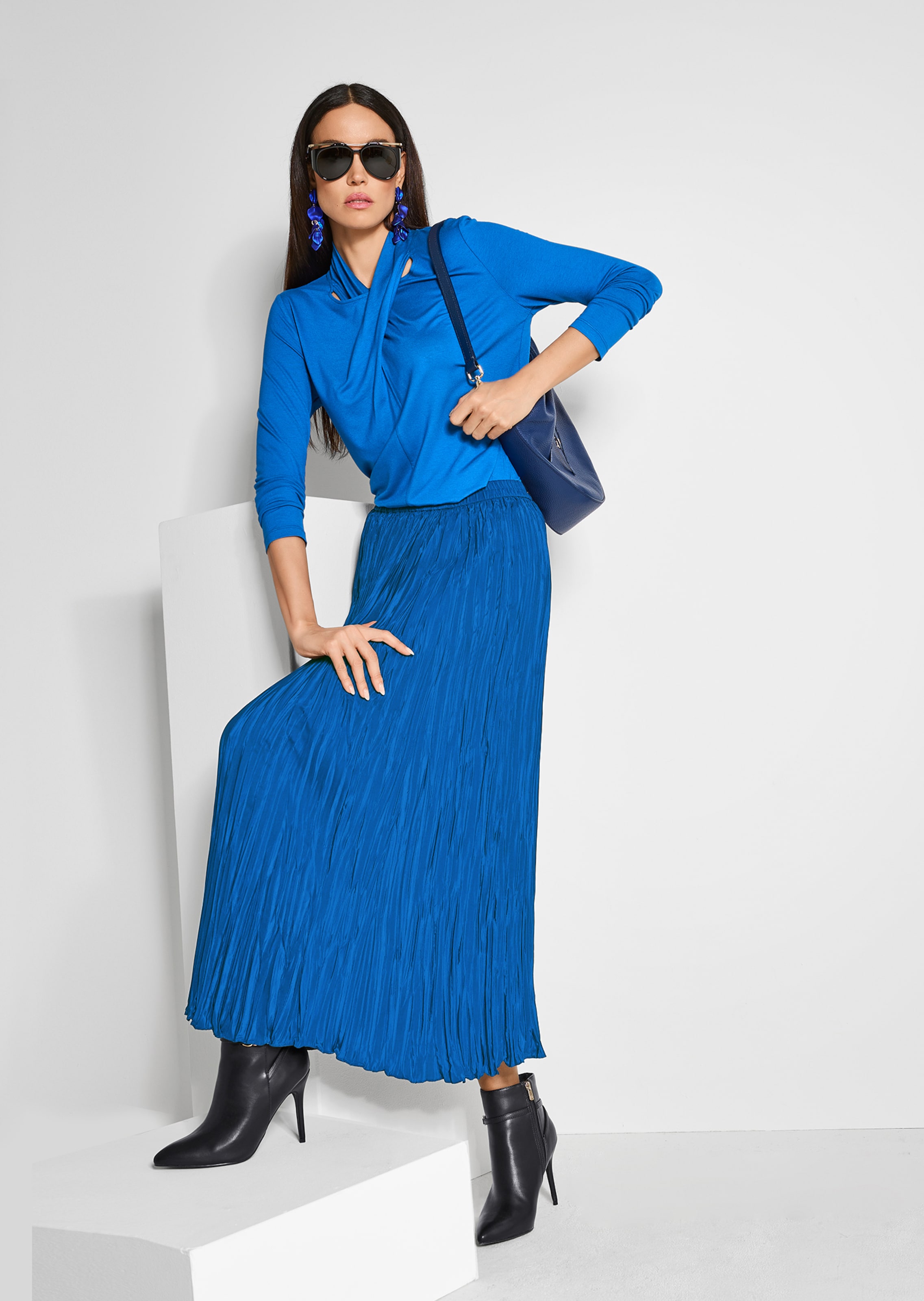 En plissé froissé. Coupe midi ample et évasée. Taille confortable.