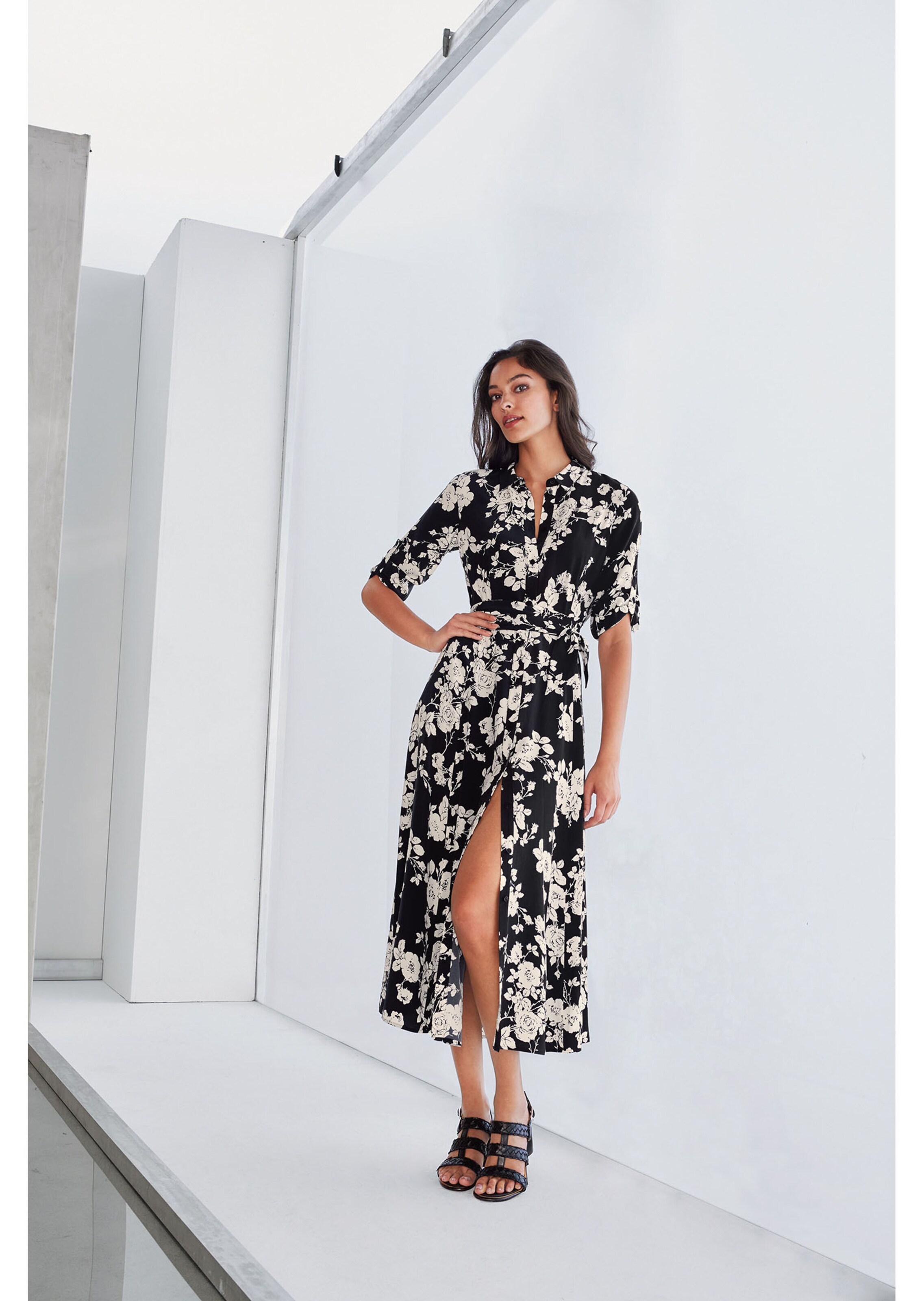 Chaque modèle est unique. Cintrée et entièrement boutonnée. Manches 3/4, ceinture à nouer et poches dans les coutures latérales.