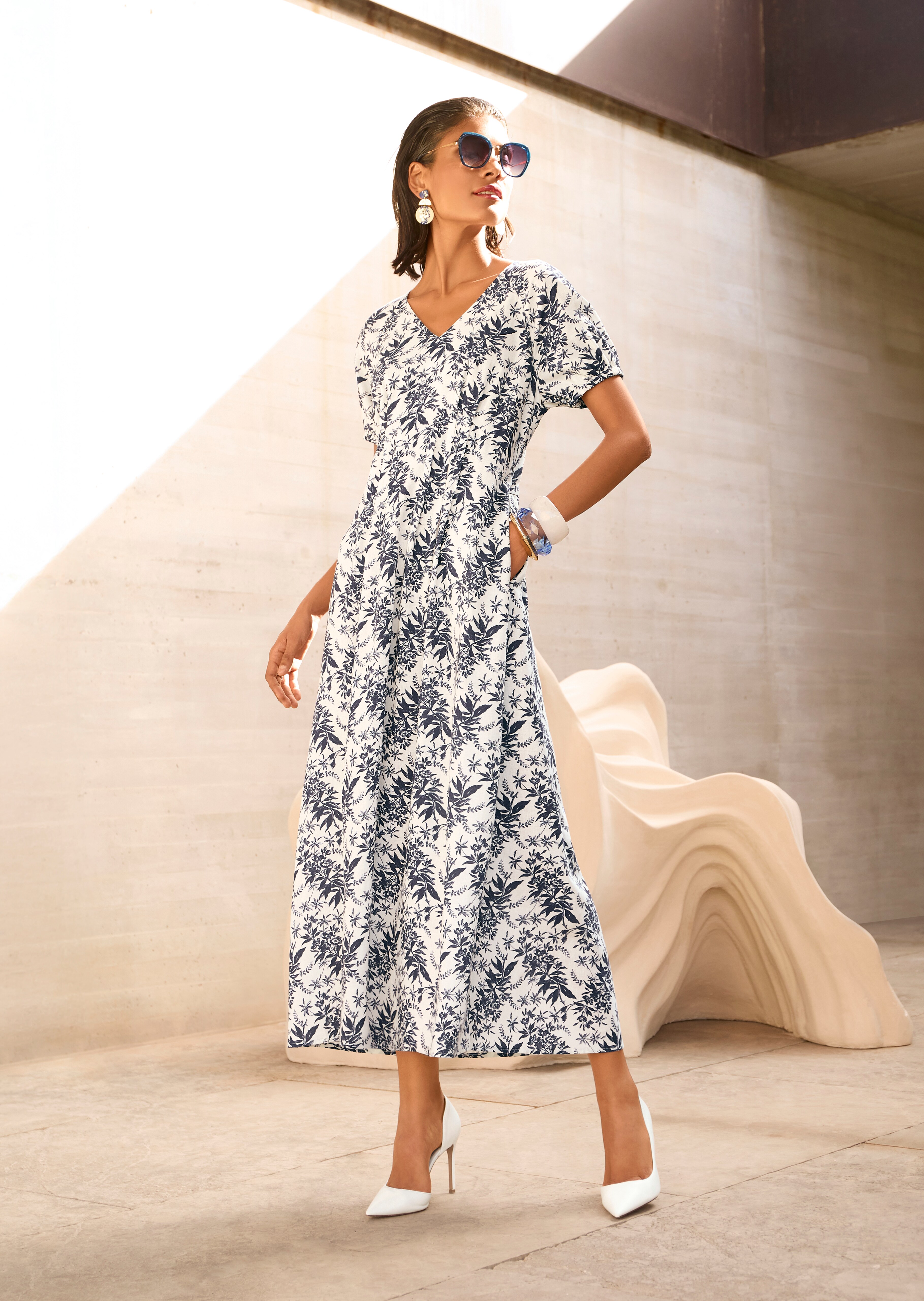 Un modèle à imprimé fleuri unique qui séduit par sa légèreté. Encolure en V et manches courtes raglan avec fin bord élastiqué. Robe cintrée avec plis et jupe large et évasée. Poches côtés pratiques dans les coutures et zip au milieu du dos.