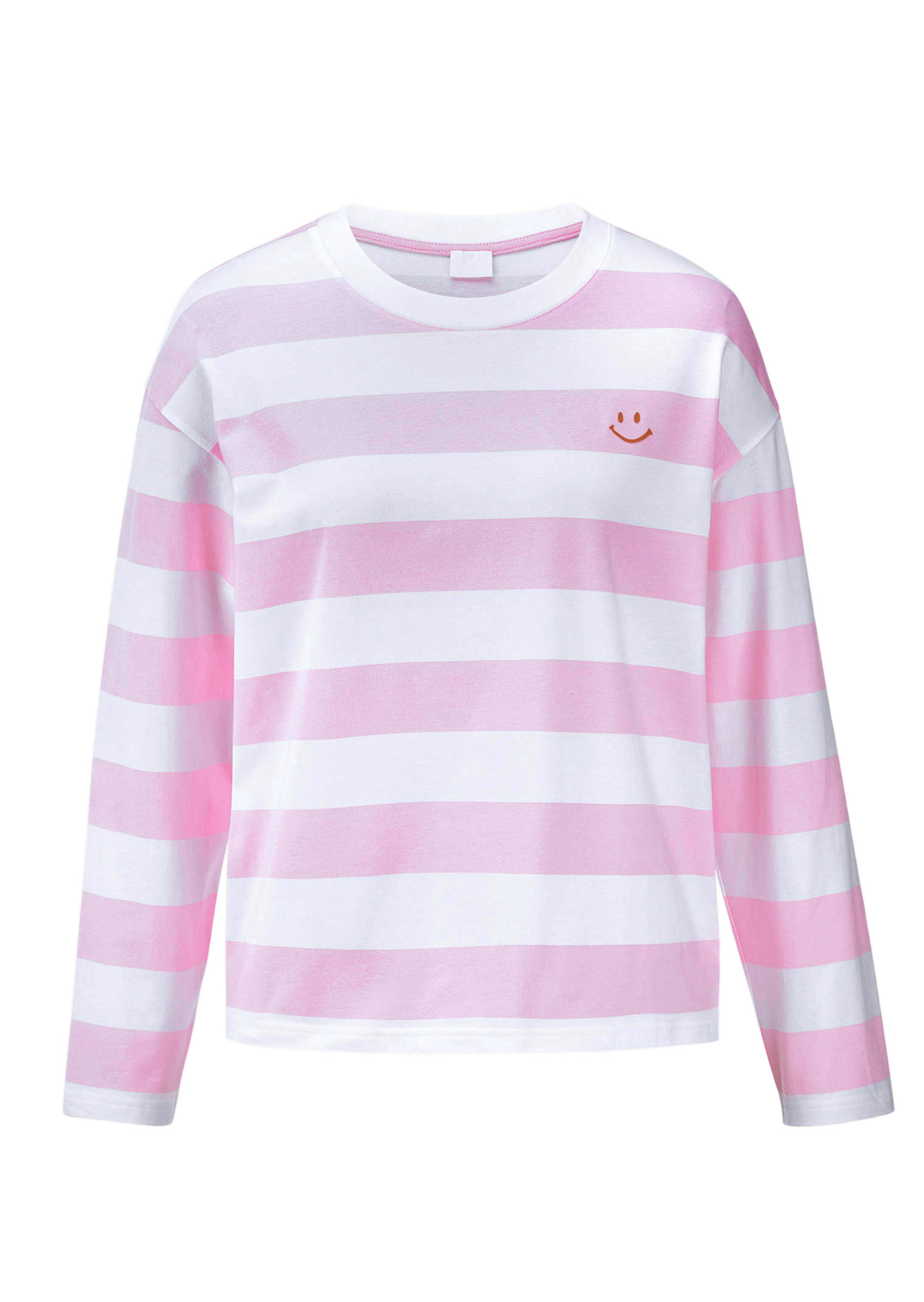 T-shirt manches longues MEY. Style rayé tendance. Le fin fil de coton au toucher doux épouse agréablement la peau et l'élasthanne garantit une tenue irréprochable et une grande liberté de mouvement. Encolure arrondie avec empiècement uni et smiley imprimé fantaisie.