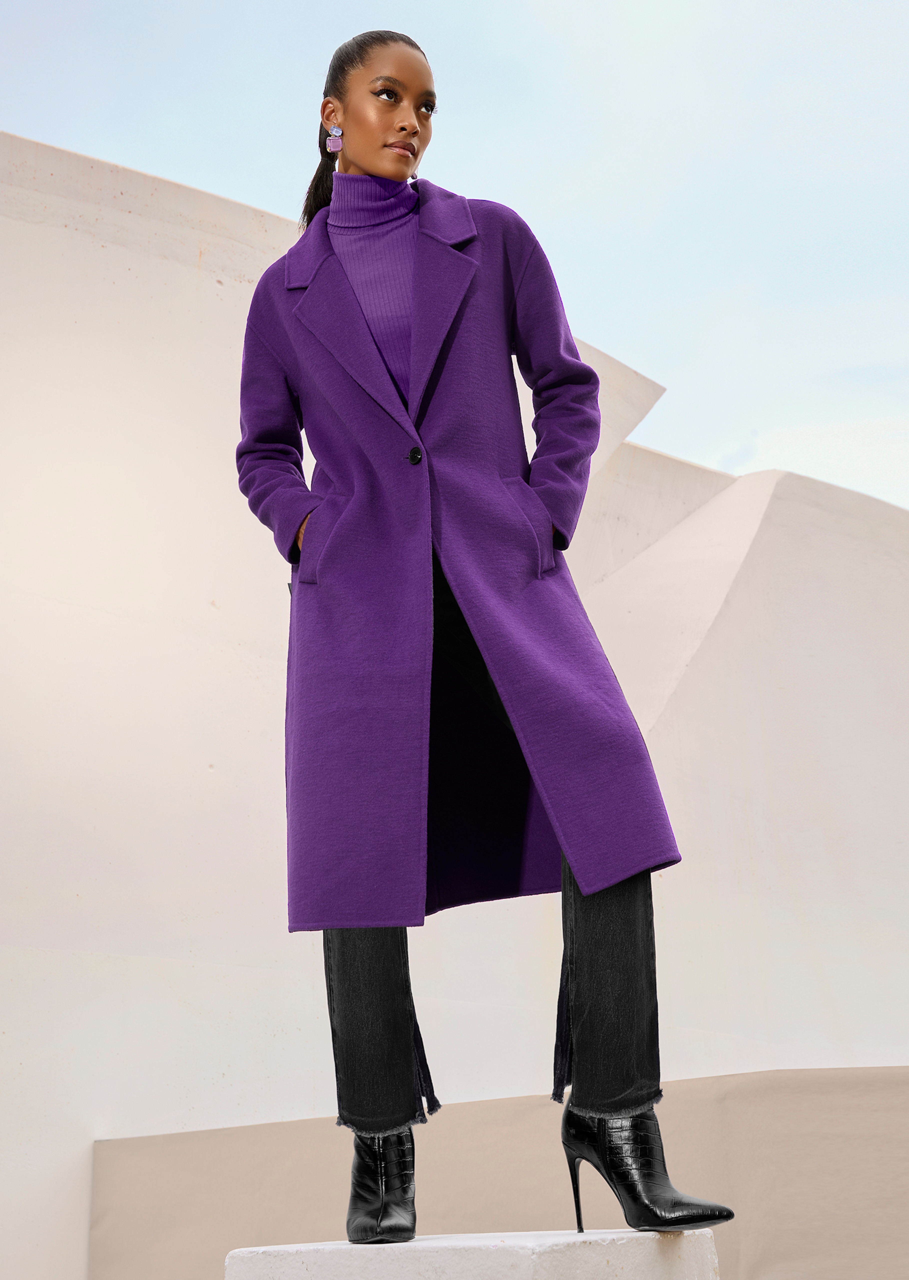 Matière naturelle haut de gamme, double face. Coupe légèrement cintrée. Profond col à revers et manches longues. Fermeture par un bouton et poches côtés.