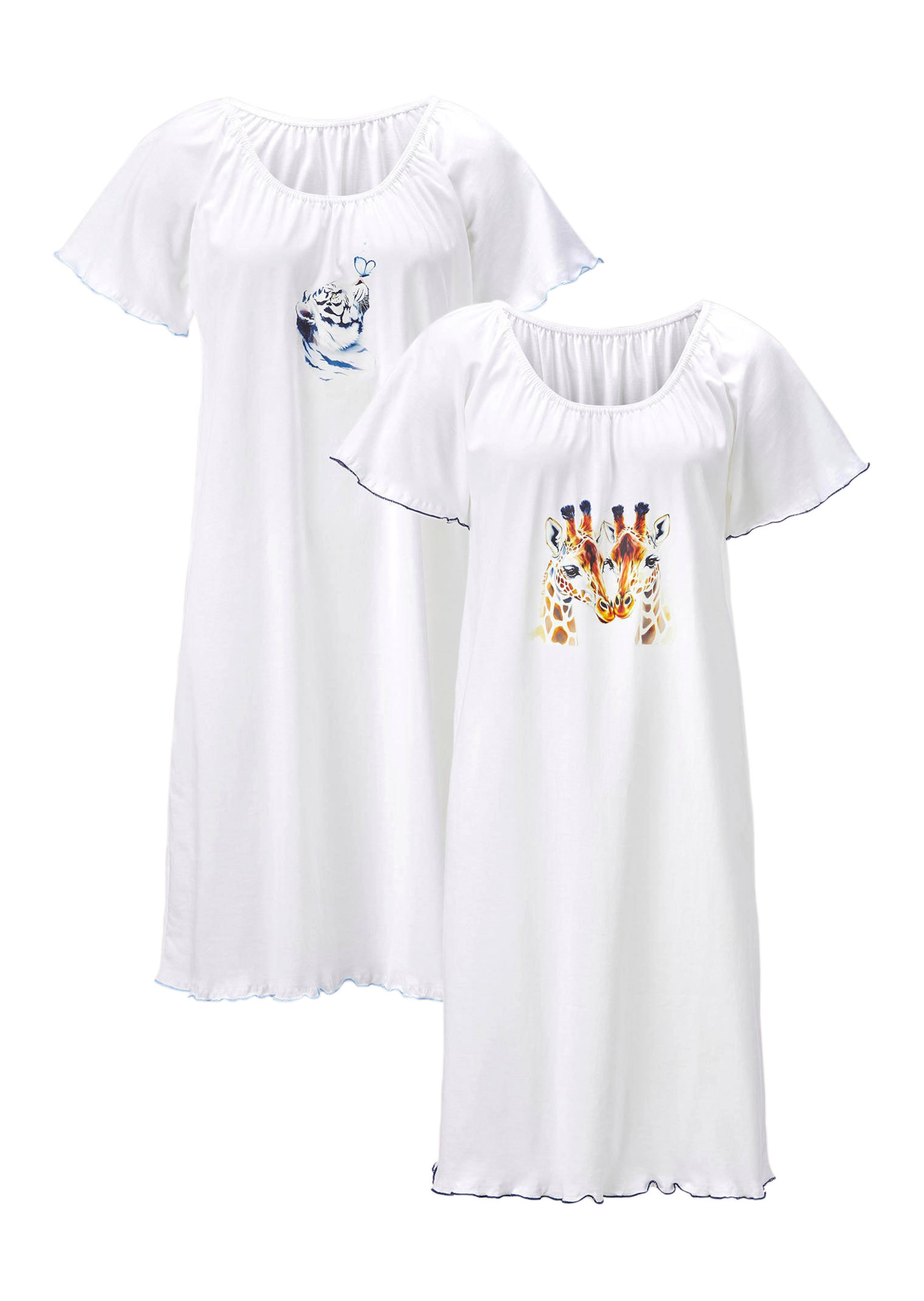 Lot de 2 chemises de nuit en pur coton doux et léger sur la peau. Pratiques et agréables, avec coupe décontractée et encolure arrondie légèrement froncée qui facilite l'habillage. Bords ondulés contrastants au bas des manches raglan et à la base, pour une note de couleur. Un motif imprimé exotique sur chacun des modèles.