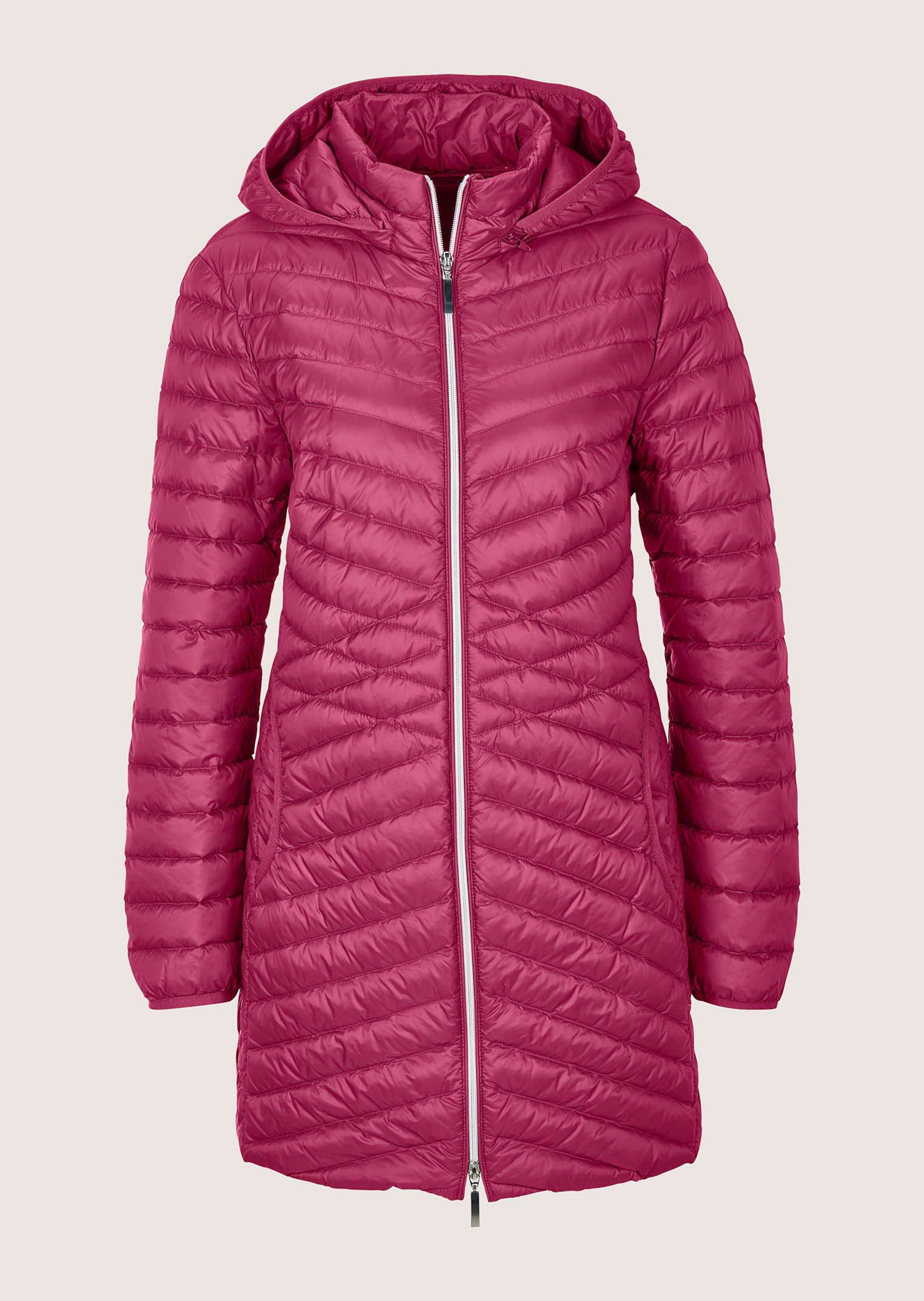 Manteau bien chaud et d'une agréable légèreté, avec garnissage duvet/plumes et surpiqûres qui flattent la silhouette. Coupe longue. Col montant et capuche qui protègent des intempéries. Empiècements extensibles sur la capuche et sur les poches. Zip double curseur qui s'ouvre aussi par le bas: très pratique en position assise ou à vélo. On aime ce manteau qui se porte en toute occasion.