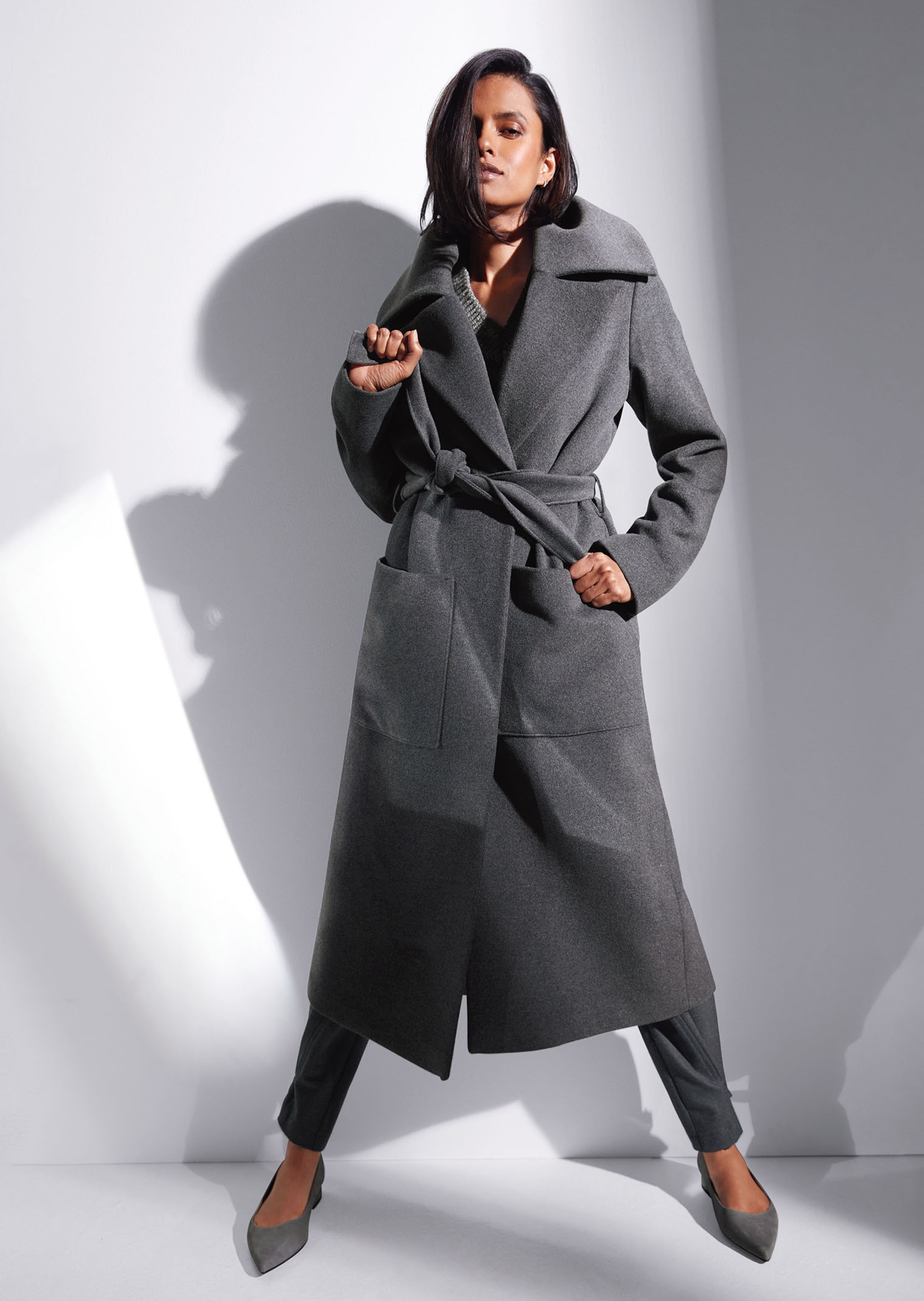 Luxueux manteau tendance et décontracté. Coupe droite confortable. Large col à revers, grandes poches plaquées, fente au dos et ceinture à nouer. Fermé par un bouton-pression.