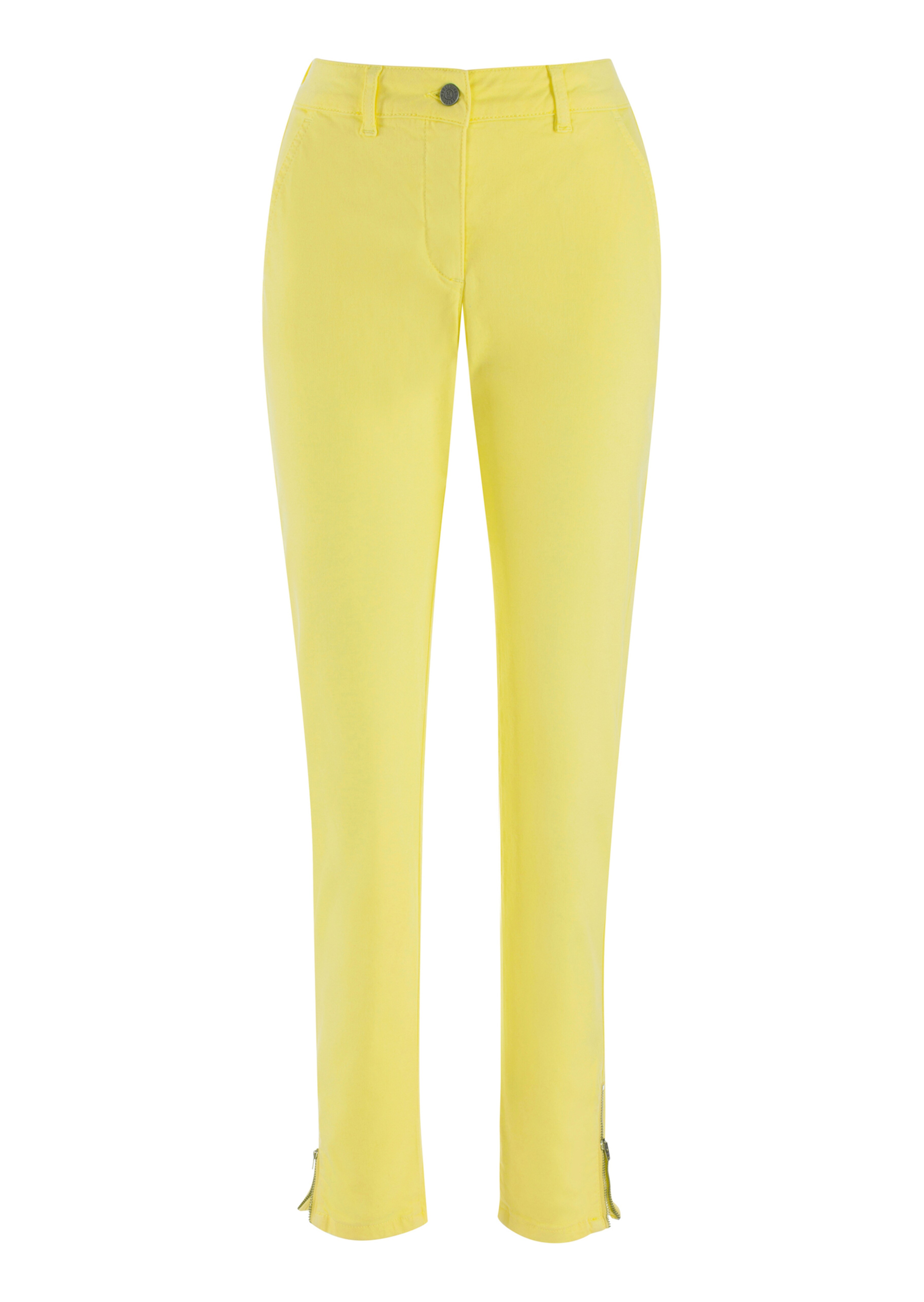 Coton stretch d'un grand confort. Style chic et sport. Poches côtés, poches plaquées au dos et zip décoratif sur le côté au bas des jambes. Ceinture à passants.