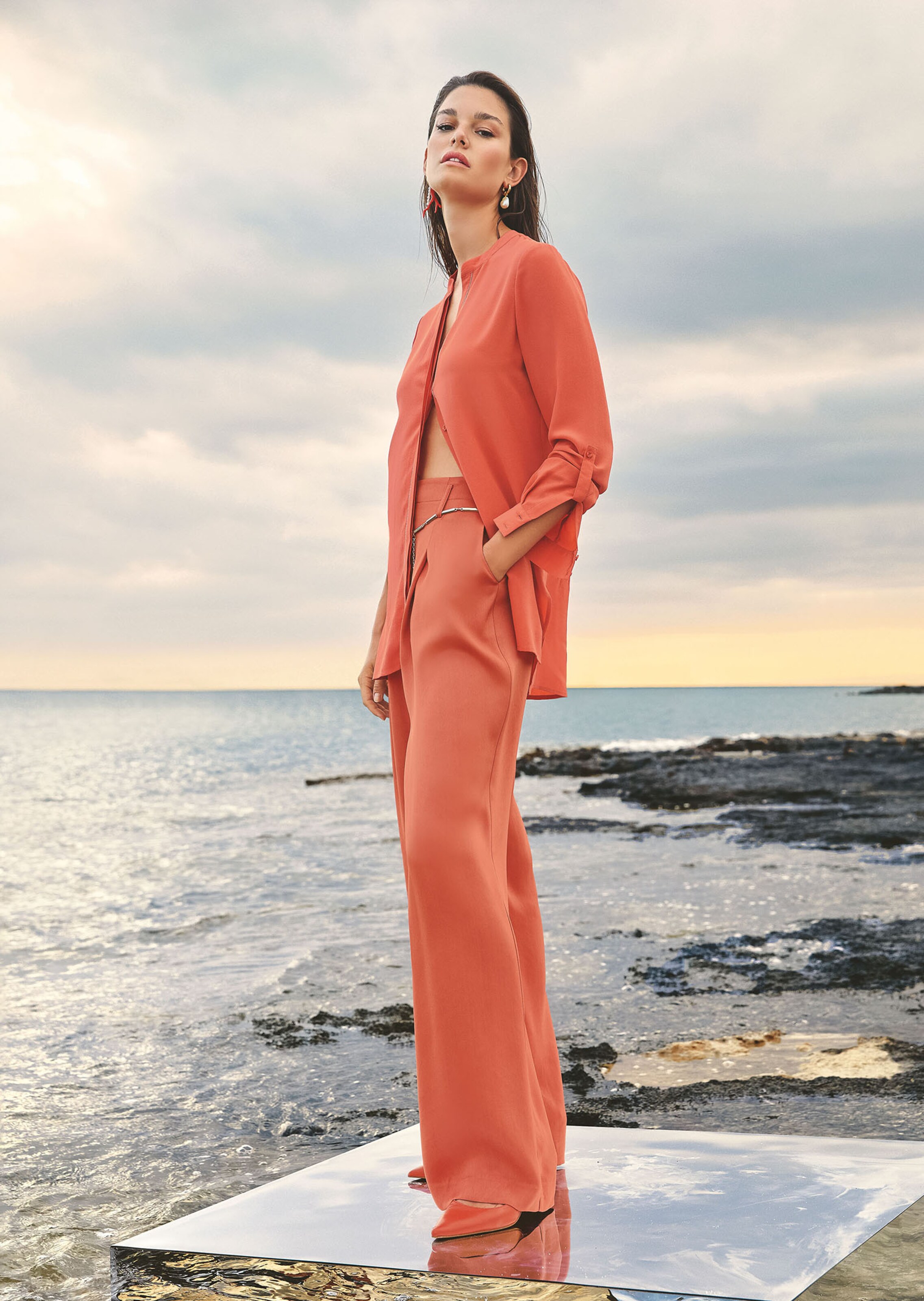 Beau satin fluide, frais et agréable sur la peau. Jambe large et élégante, pinces à la taille et poches côtés en biais. Passants et bouton de coloris assorti.