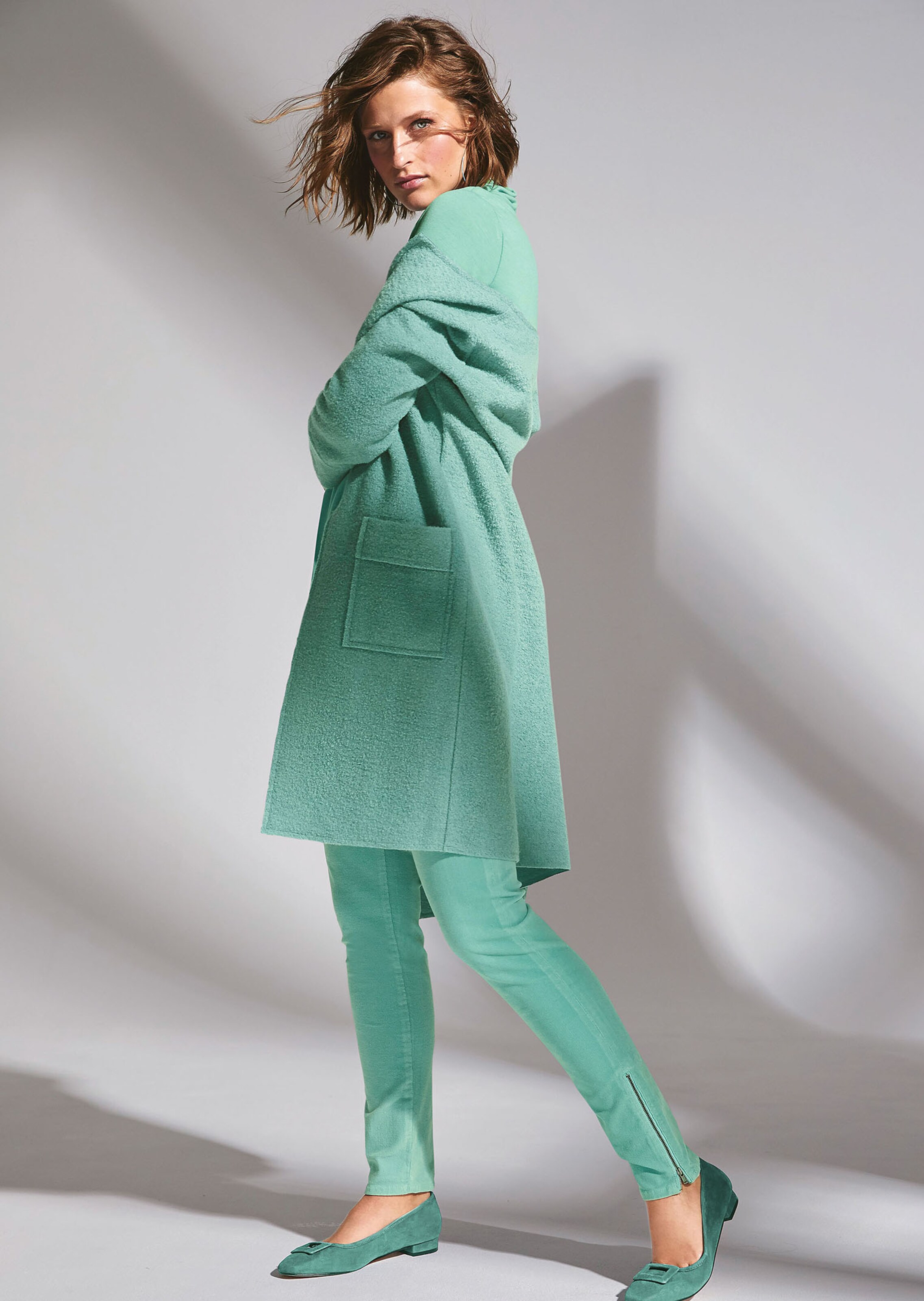 Beau velours côtelé, ligne près du corps. 5 poches, fine ceinture à passants, bouton siglé et bas zippé.