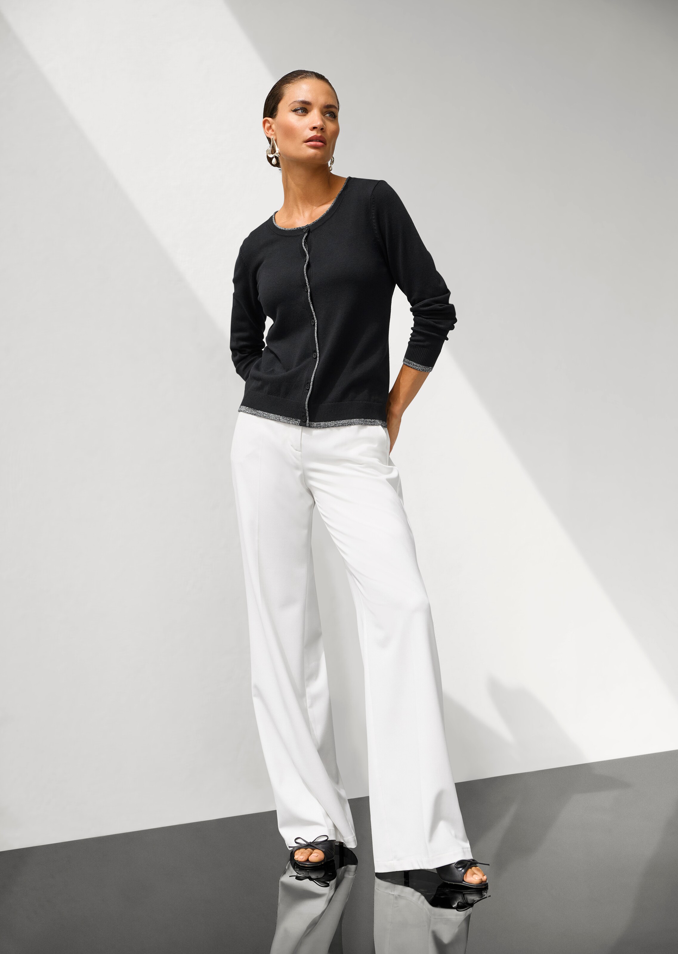 Jambes larges, plis marqués devant et au dos et poches côtés en biais. Passants de ceinture et fausses poches au dos.