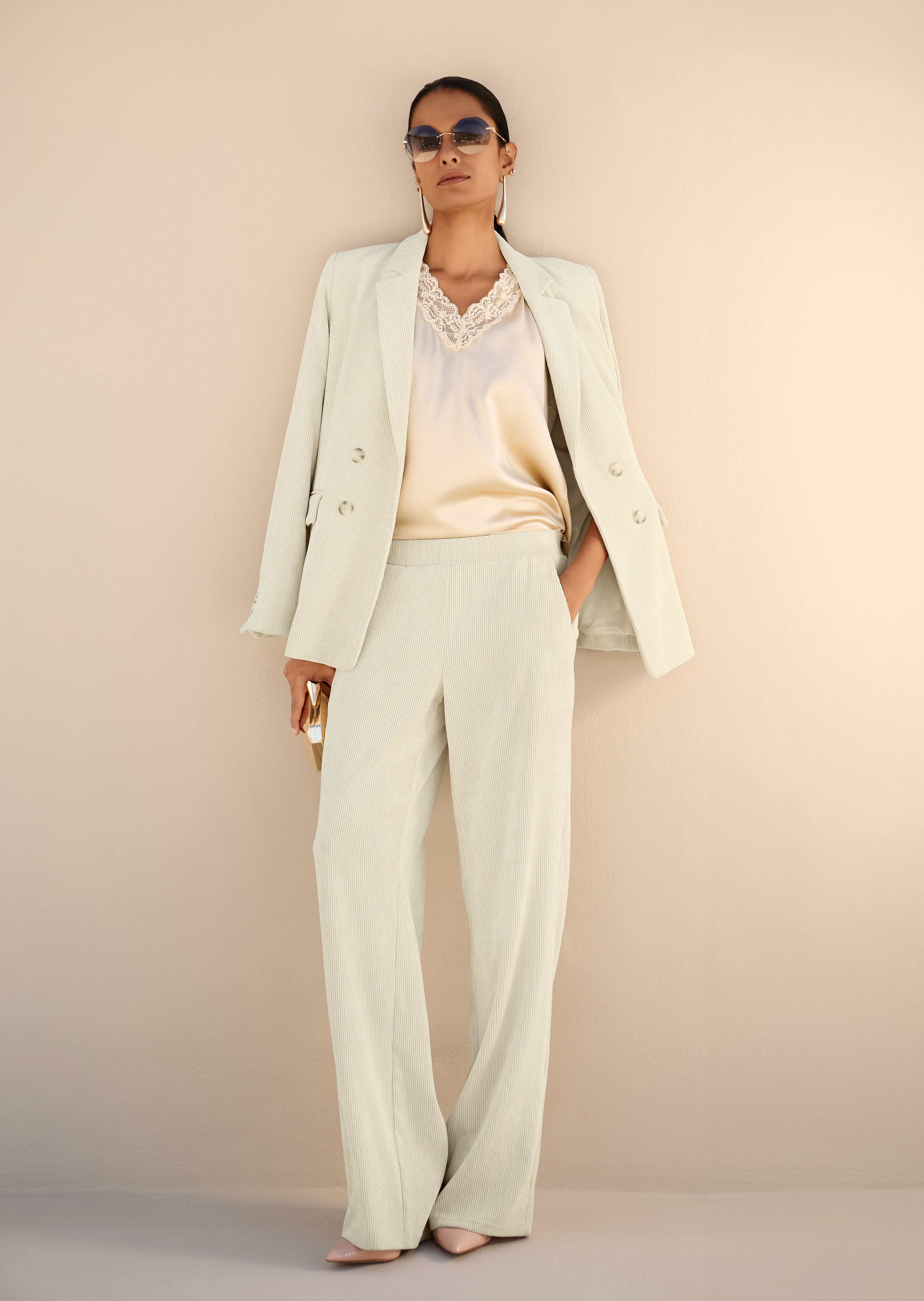 Velours côtelé doux et très confortable. Coupe large tendance. Large taille élastiquée pratique. Poches côtés.