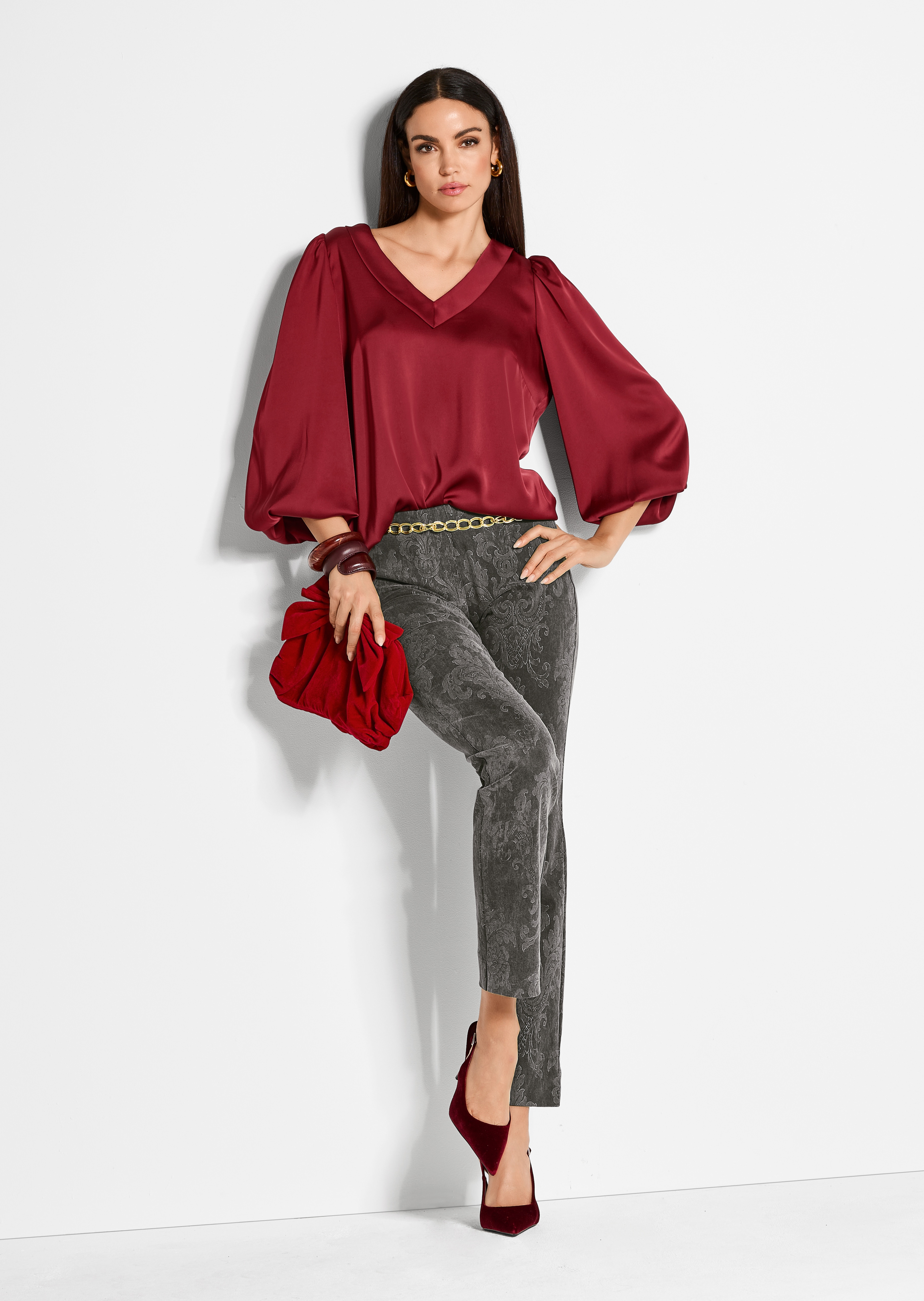 Coton stretch très souple et légèrement gratté, avec subtil imprimé cachemire. Modèle pratique et très agréable à porter, avec découpe au dos, petite fente au bas des jambes et large taille élastiquée.