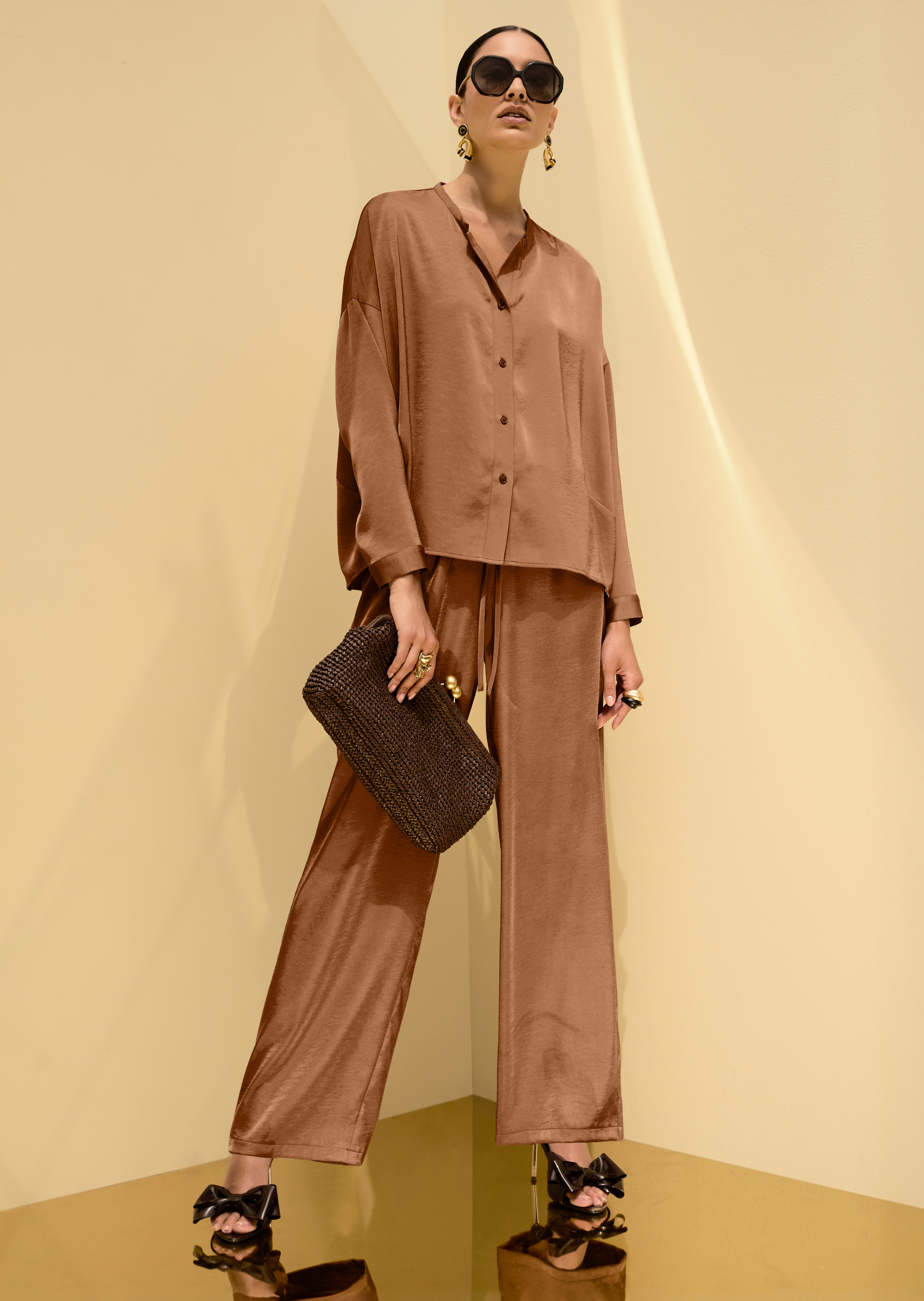 Un pantalon en satin fluide qui sublimera votre look. Jambes droites et larges, taille élastiquée et ruban fantaisie. Poches côtés pratiques.