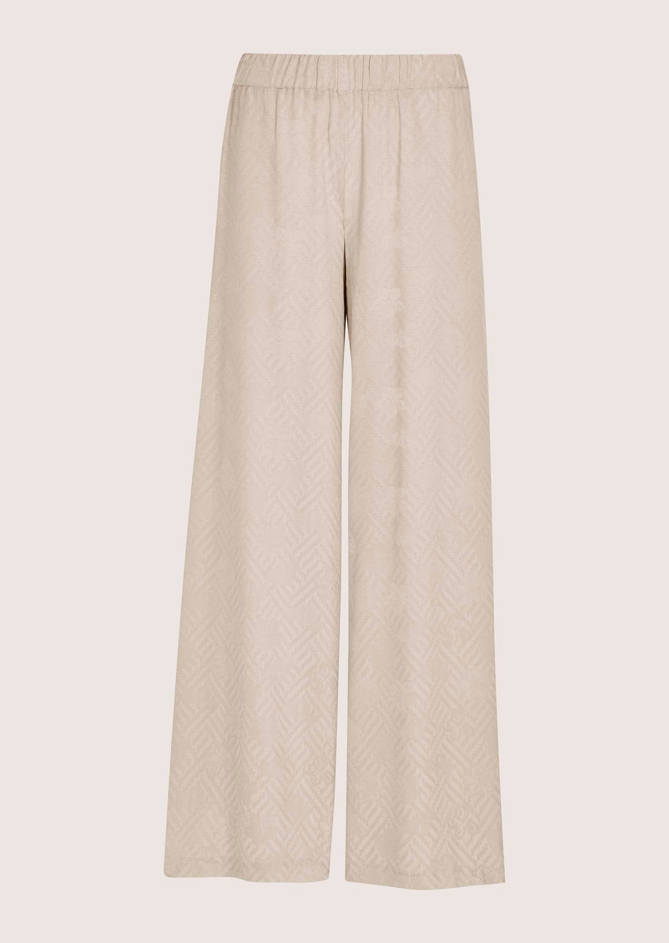 Ligne décontractée, avec sublime motif jacquard ton sur ton. Viscose fluide, taille élastiquée et poches côtés. Jambes droites et larges.