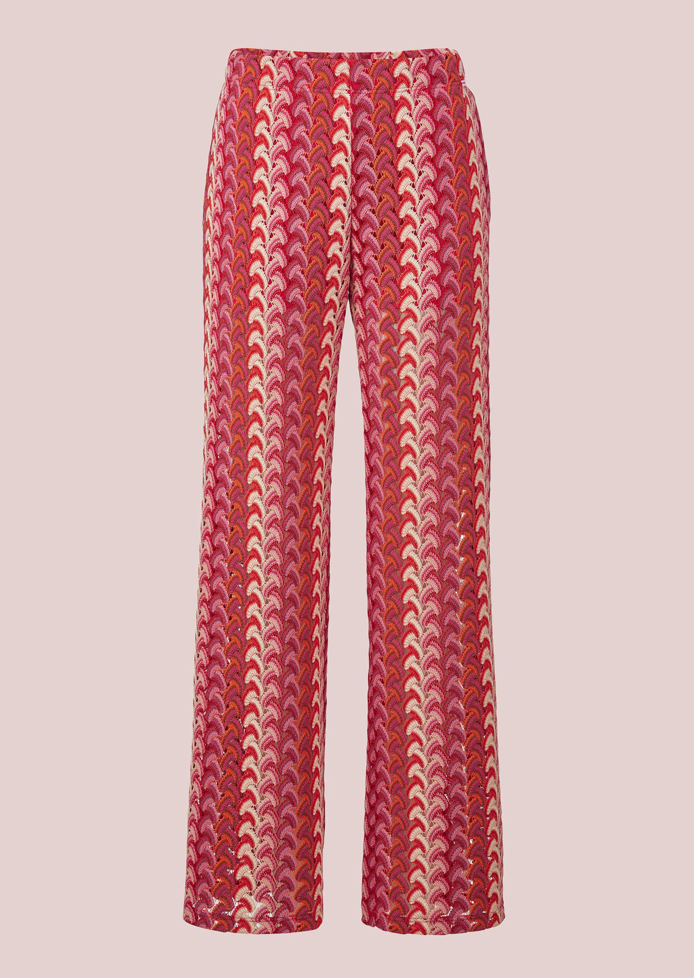 Pantalon de loisirs RÖSCH. Modèle léger avec délicat motif dentelle aspect crochet. Les couleurs harmonieuses soulignent le style féminin et la maille à l'entretien facile offre une agréable liberté de mouvement. Taille entièrement élastiquée et deux poches. Une pièce chic et estivale à la ligne tendance, avec jambes droites.