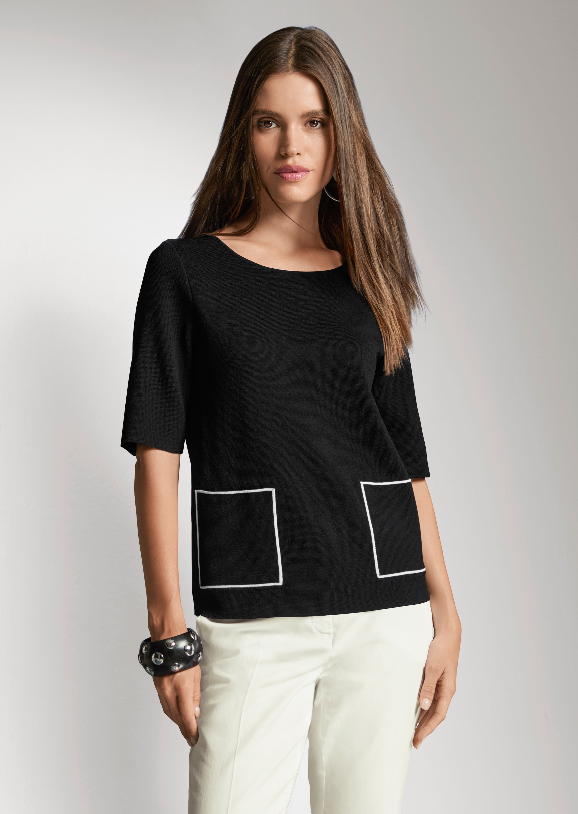 Le chic des sixties revisité: ligne décontractée, encolure arrondie, manches courtes et poches plaquées aux bords soulignés d'un passepoil contrastant.