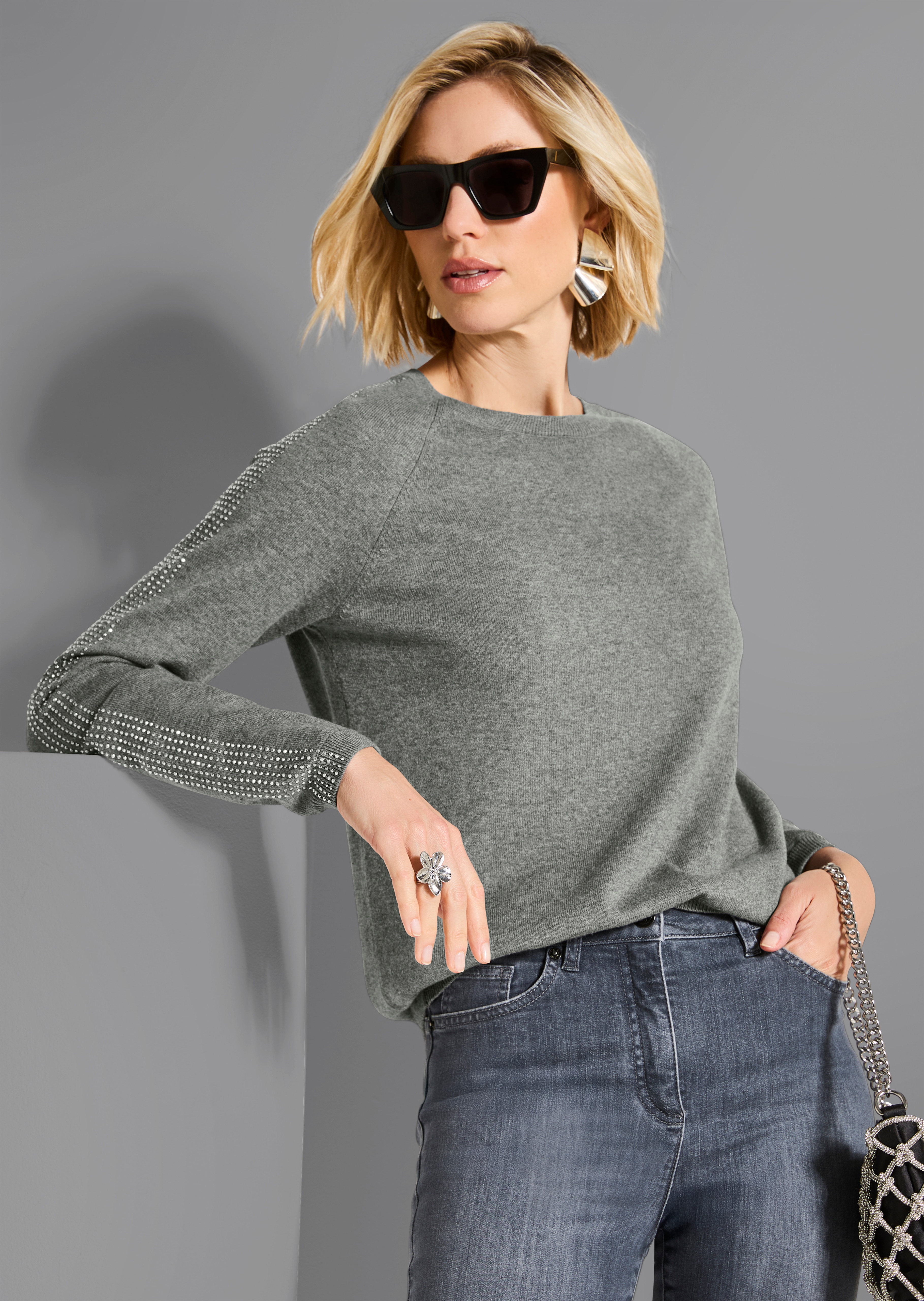 Ce pull est sublimé par les manches raglan soulignées de strass. Fil mélangé très doux avec du cachemire. Bords-côtes et encolure arrondie.
