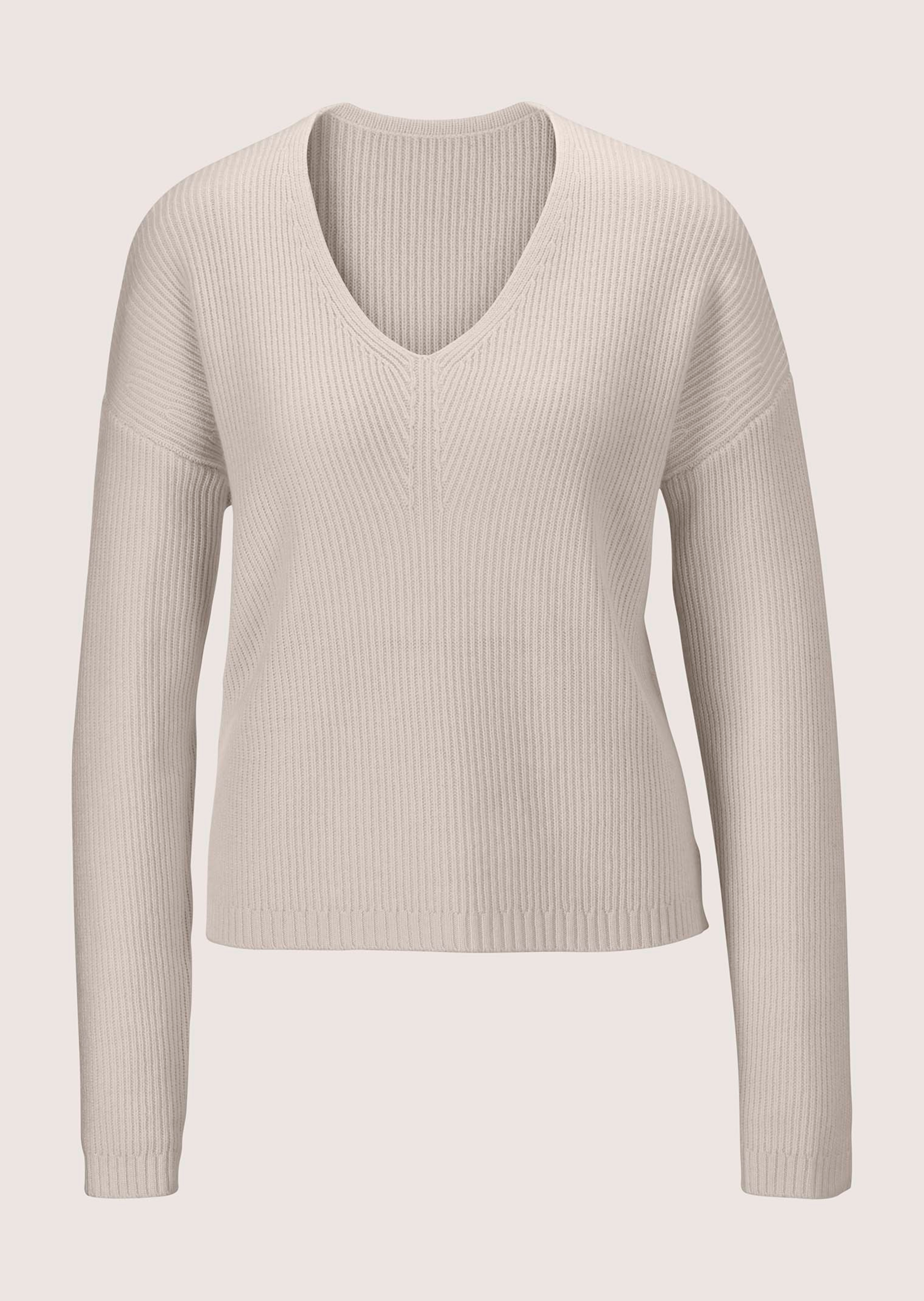 Luxueux fil duveteux. Fine structure côtelée, avec diminutions fantaisie devant. Coupe décontractée. Encolure en V, manches longues et fentes latérales. Dos plus long. Bords-côtes d'une tenue irréprochable au bas des manches et à la base.
