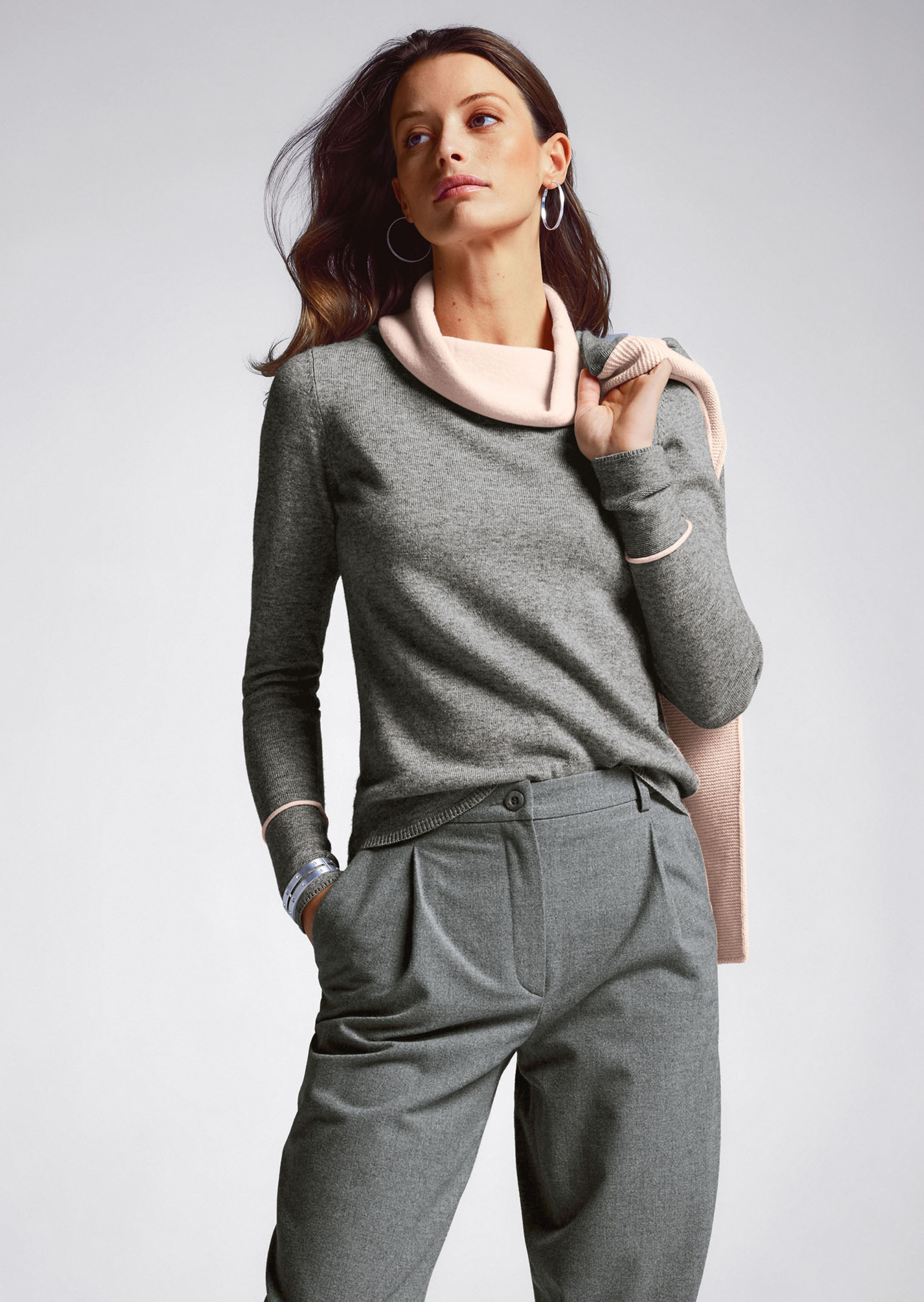 Look sport décontracté. Grand col roulé dégagé contrastant et fins détails contrastants au bas des manches longues. Coupe droite. Maille douce et moelleuse enrichie d'une touche de cachemire.
