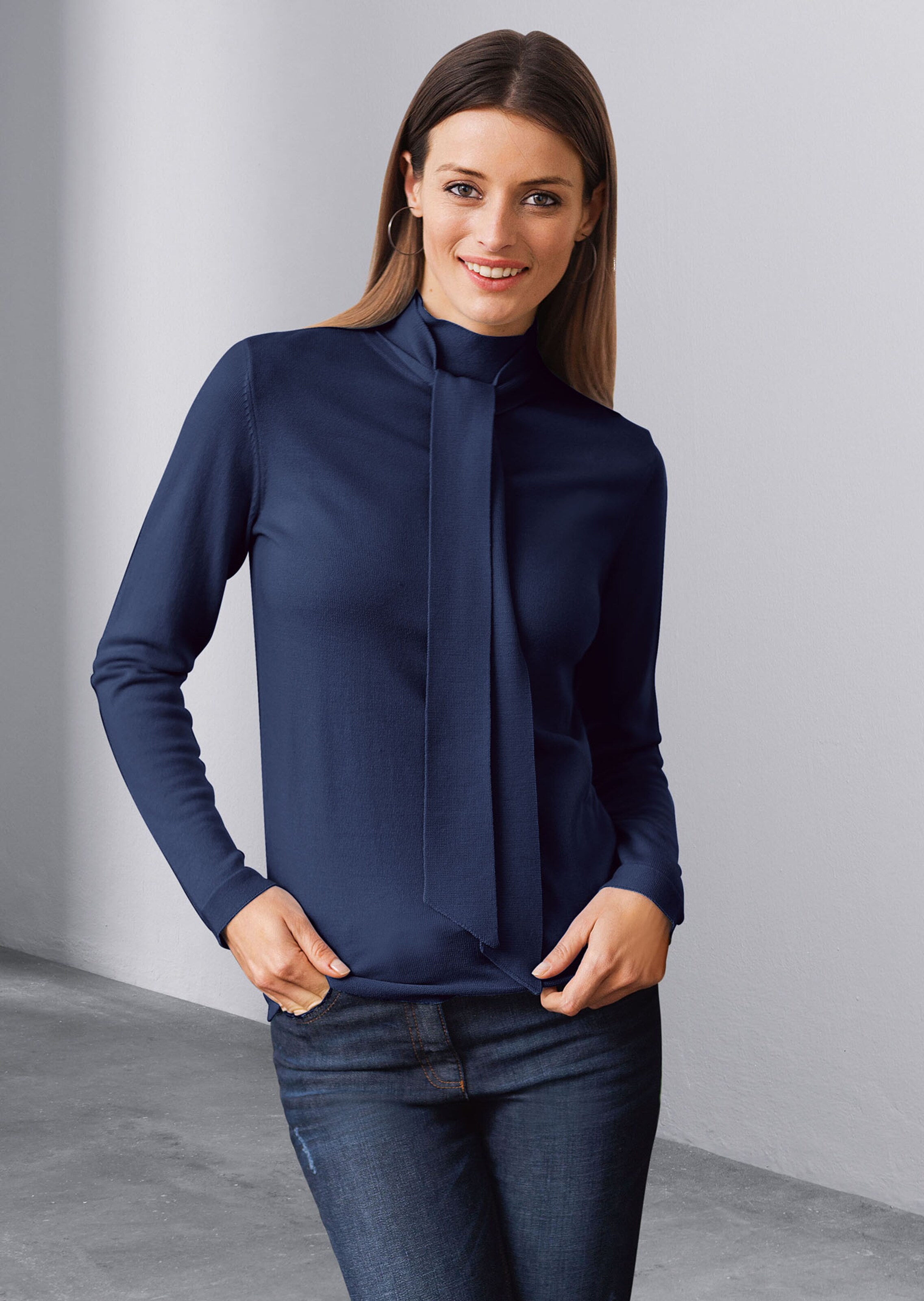Fine maille duveteuse en jersey endroit. Ligne élancée. Lavallière à nouer, col montant, manches longues et bords-côtes.