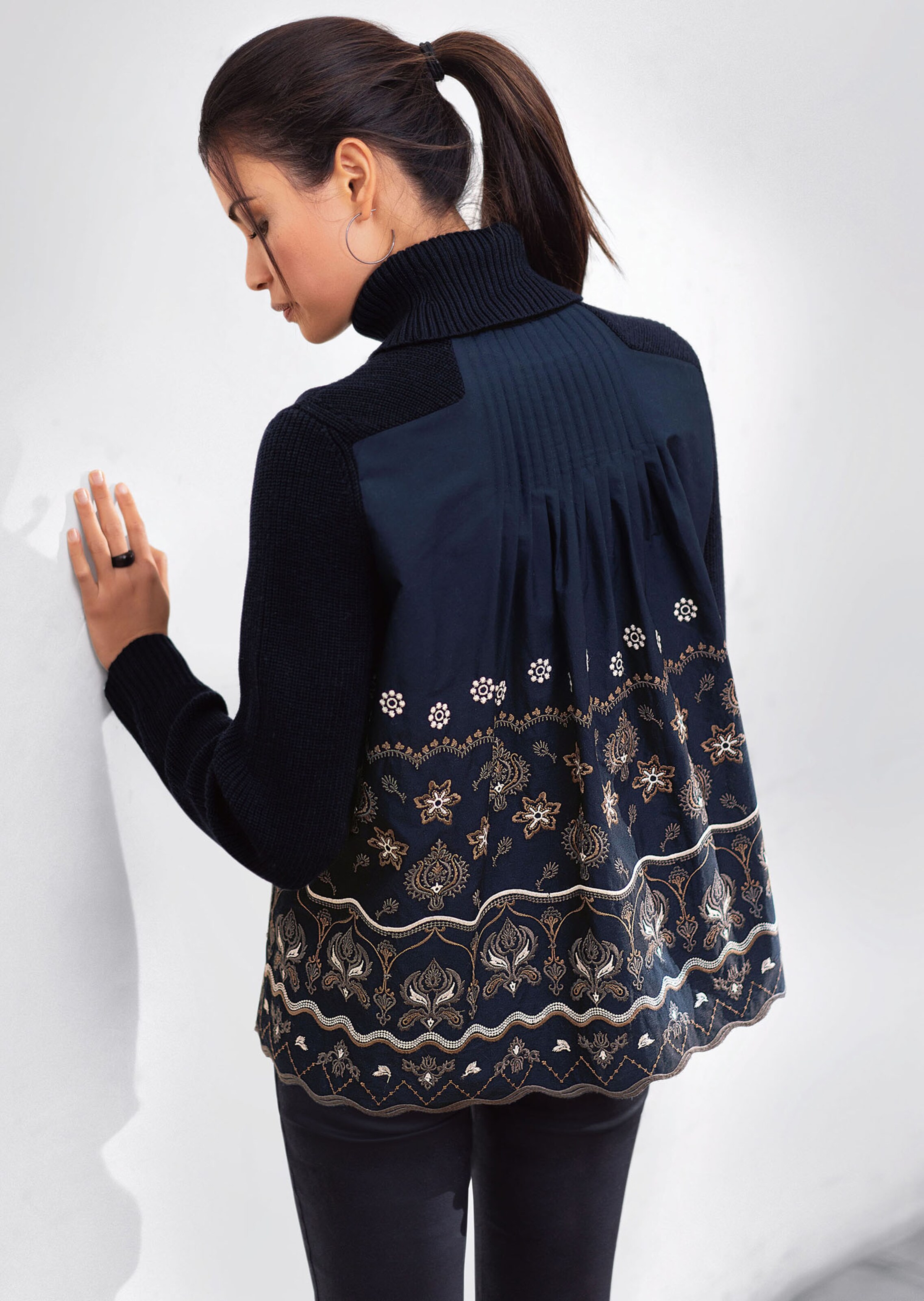 Style bimatière: douce maille côtelée en laine de mérinos devant et dos en coton brodé qui se prolonge en biais sur les côtés du devant. Col roulé dégagé, manches longues et bords-côtes.