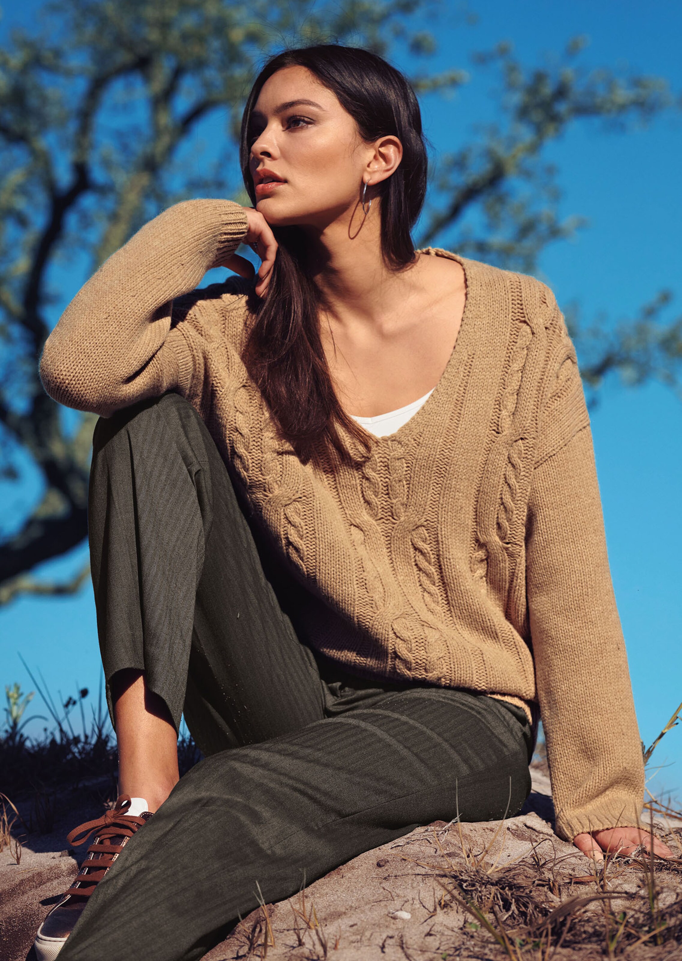 Modèle haut de gamme doux et facile à coordonner. Tricoté fully fashioned. Motif torsadé classique, encolure en V, manches longues et bords-côtes d'une tenue irréprochable.