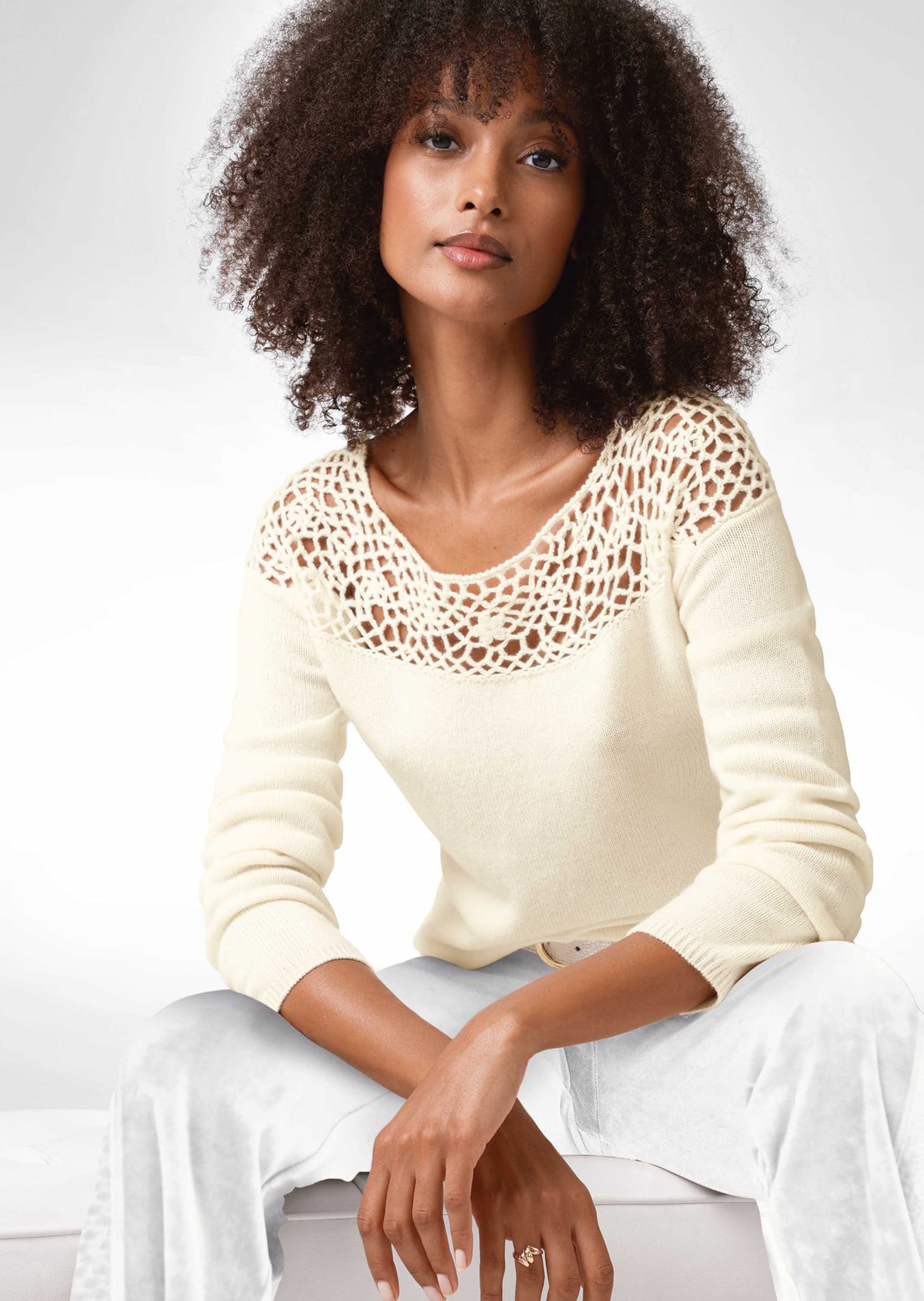 Maille douce. Encolure arrondie rehaussée de dentelle au crochet. Coupe légèrement cintrée. Bords-côtes.
